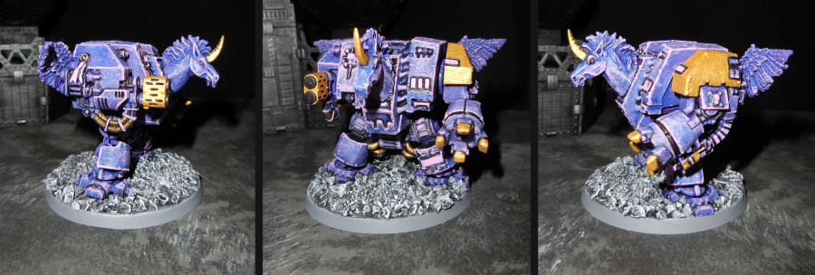 „Ich werde auf Euch warten“ sprach er, als er die Tür hinter mir schloss. Der Raum war quasi ein Würfel. Zehn Meter hoch, breit und tief. In der Mitte ein Berg aus Metall, ein Cybot. Im Prinzip ein gewöhnliches Castaferrum Modell. Aber natürlich im rosa-lila Ton, den die Rüstungen der Marines auch zeigten. Auf der Frontplatte des Sarkophages war eine recht realistische Pferdekopfplastik mit auffälligem Horn angebracht. Kleine stilisierte Flügel an den Seiten des Rückenteiles rundeten das Bild ab. Das war also ein Allmighty Alicorn, einer der alten Veteranen.