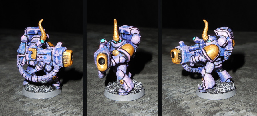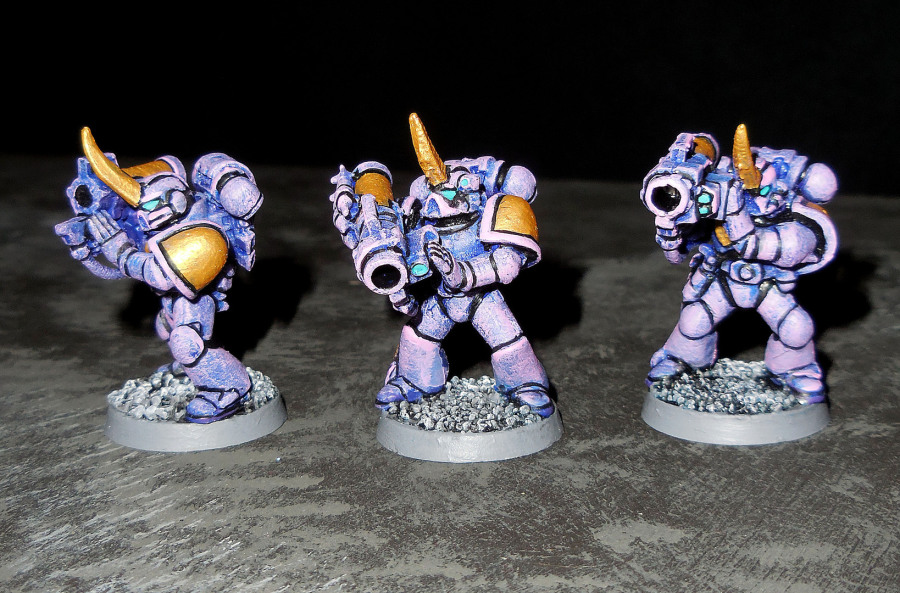 Ich brauche auch noch einen anderen Befehlshaber. Der Kollege in Terminatorrüstung ist ja wirklich nett, aber hierfür nicht das Richtige. Ich hätte gerne einen ganz normalen Veteran mit einer Bolter-Plasma-Kombiwaffe. Den stückele ich mir aus einigen Blood Angels Expudingsbumsgarde-Kerlchen zusammen. Das sind also elf Mann zu bemalen. Wenigstens muss man nicht viel umbauen. Vor allem Hörner drauf. Verschiedenste Stacheln und Klingen und vor allem Chaoskriegerhörner werden verklebt. Der Chef kriegt was besonderes, eine Hexenkriegerinnenklinge.