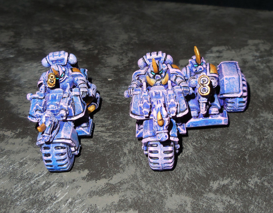 Was sagen denn da unsere Vorräte? Ein alter Ravenwing Sergeant. Jo, dat geit (zu Deutsch: Ja, das geht). Kopf mithilfe eines Seitenschneiders ab, halber Helm drauf, gut ist (Menne, bei die Abbeit Helme auf!). Ich mag die Rüstungen mit dem hohen Kragen eigentlich ganz gern. Schnell noch einen Plasmawerfer aus den Händen eines Verrätermarines befreien, die Zeichen von Nurglebefall mittels Feile entfernen, fertig (passt wieder perfekt zum Fluff!). Also fast fertig. Der Kollege hat auch noch ein geflügeltes Schwert am Bein, doch auch da schafft die Feile Abhilfe. Ach ja, die alte Bodenplatte muss ab. Löcher in die Reifen, Magnete rein und Drahtstifte als Standhilfe in die Fußrasten. Das hätten wir schon mal. Na ja, was fehlt wohl? Pferdekopf mit Horn, ein Grenadierpferd spendet bereitwillig. (Übrigens hat sich zum Fototermin nun auch das verschollene Trike aus Episode 4 eingefunden.)