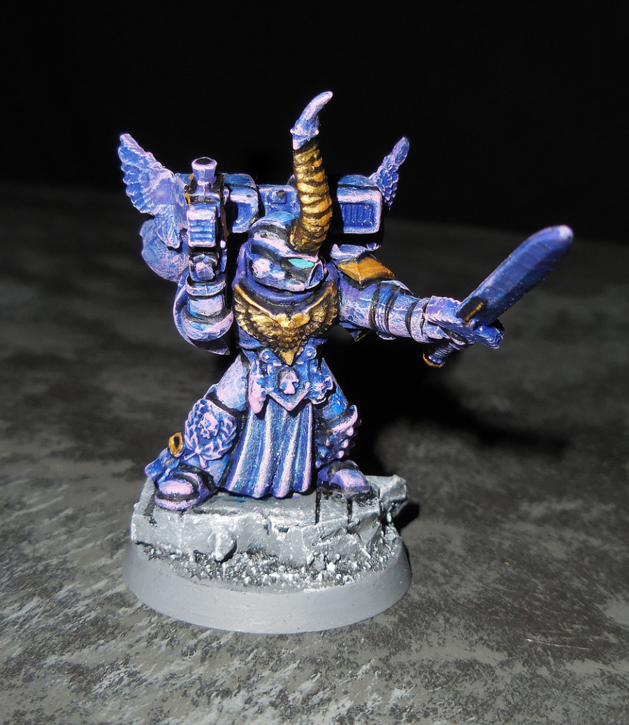 Als Letztes ein Anführer. Weder der eine Termi noch der Veteran mit Kombi-Plasma-Bolter sind wirklich gut geeignet einen Sturmangriff anzuführen. Daher nehme ich einen der Kollegen des Plasma-Bolter-Veterans, also einen ehemaligen Blood Angel. Der kriegt kurzerhand eine Boltpistole, ein Energieschwert, einen Sprungpack und ein richtig fettes Chaoskrieger-Horn. Ja, so ein Kerl kann die Zentauren ins Feld führen. Auch der ab zum Grundieren. Dann mal noch eben alles Inken, Trockenbürsten, Details drauf, Abkorrigieren, Peer Review, noch mal Korrigieren und Coat drauf!