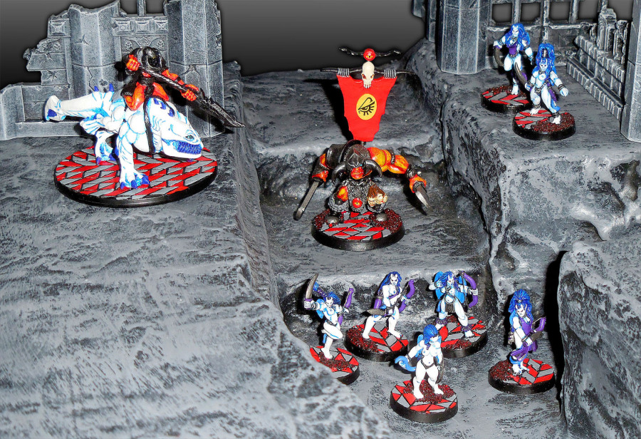 Als Basistrupps dienen Sirenen, die weiblichen Succubus-Dämonen. Entfernt erinnern sie an Warhammer Fantasy Battle Dämonetten, auch wenn die hier doch noch schicker aussehen. Die Figuren sind etwas variabel, manche sind nur mit Messern bewaffnet, andere haben Bögen. Einige tragen kleine Fledermausflügel auf dem Rücken. Allesamt sind sie eher spärlich bekleidet, einige mit entblößten Brüsten. Das gehört sicher zur Kampftaktik, unterstreicht aber auch, warum diese Modelle Violett als Hauptfarbe haben müssen. Angeführt werden die Sirenen von Meduinn, die mit besonders wenig Kleidung ausgestattet ist. Diese Modelle könnte man ganz klar auch in eine WHFB Slaneesh-Armee aufnehmen.