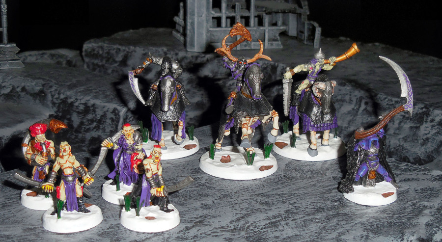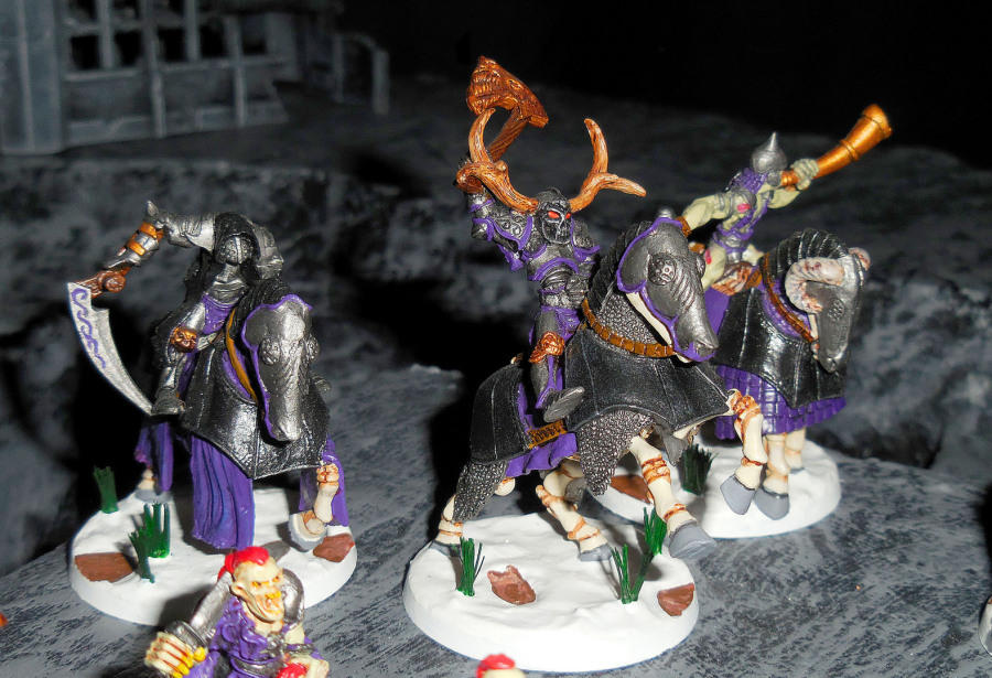 Als Basistrupp dient eine Vier-Mann-Zombie-Einheit. Ok, die heißen Flesh Eater, wären also eher Ghule, aber Leute, die sehen doch ganz klar nach Zombies aus. Gescheite Zombies, nicht dieser neumodische Walking-Dead-Kram. Der Trupp hat sogar einen Musiker, in diesem Fall ein Hornbläser. Zombie-Modelle (oder Verwandtes) sind immer etwas schwierig, wir ziehen daher eigentlich zumeist Skelette vor (die sind irgendwie aufgeräumter, weil halt schon jemand das ganze unnötige gammelnde Fleisch entfernt hat). Aber diese Zombies sind echt gut gelungen, man hat hier in der Tat das Gefühl verrottende Celtos-Barbaren vor sich zu haben. Man muss sich allerdings mal wieder überlegen ob Untote überhaupt in ein Horn pusten können....