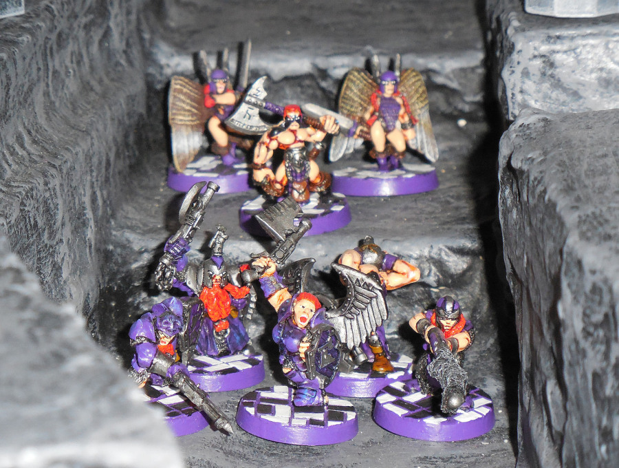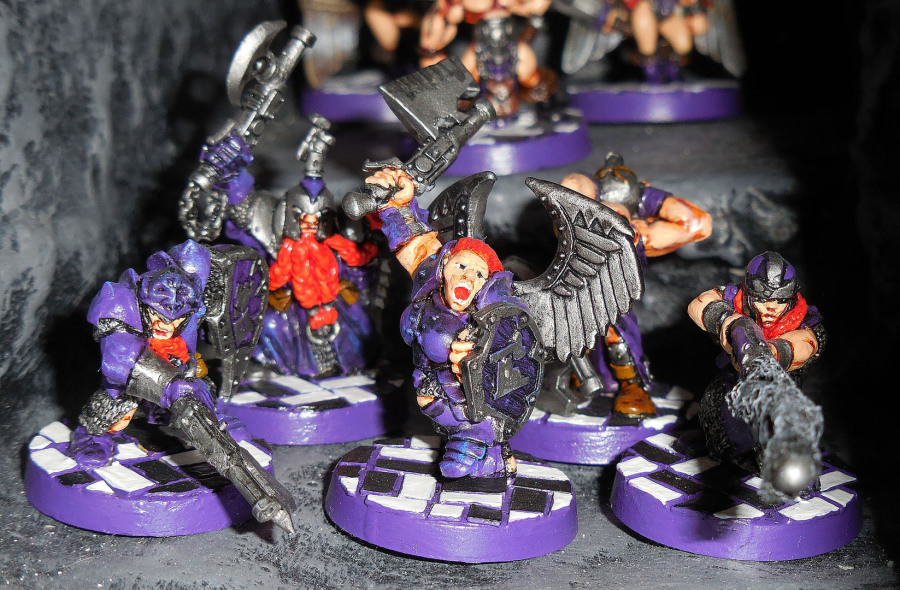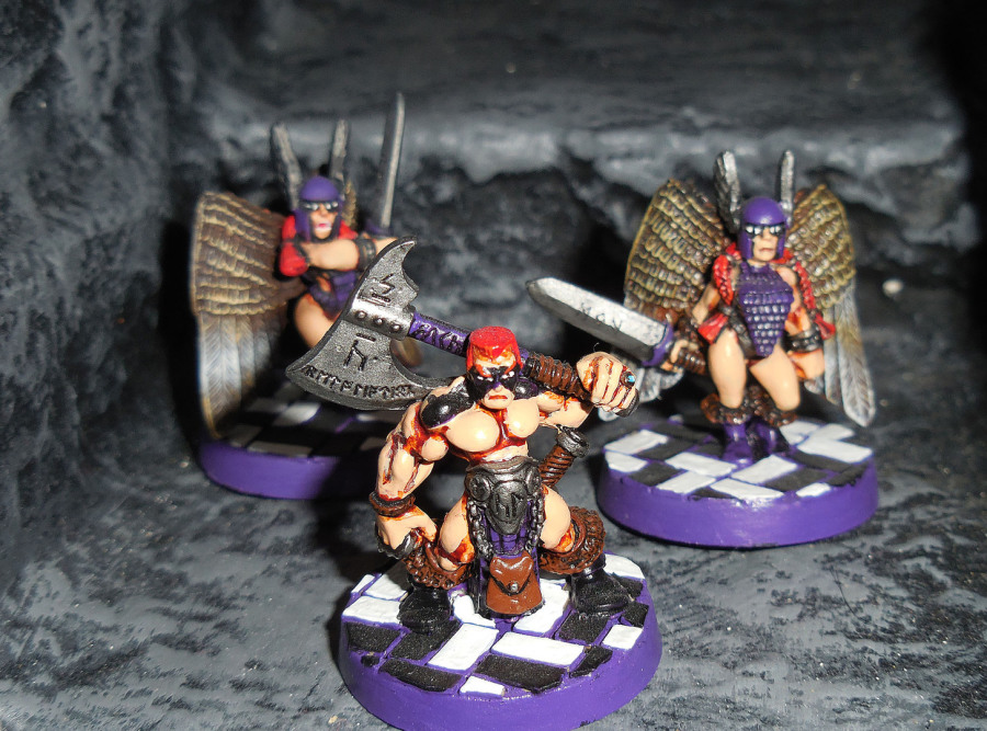 'Zwergenfrauen' ist in vielerlei Hinsicht ein heikles Thema, noch mehr als Frauen in Fantasyspielen im Allgemeinen. In vielen Hintergrundwelten wird irgendwie davon ausgegangen, dass es zwar Zwergenfrauen gibt und man diese auch ständig sieht, aber nicht als solche wahrnimmt, weil sie genauso aussehen wie die Zwergenmänner (über die Tücken diese Konstrukts kann man in Terry Pratchett's Scheibenwelt in den späteren Büchern der Wache-Reihe ab 'Hohle Köpfe' nachlesen). Bei Celtos-Zwergen ist das anders. Der Hintergrundgeschichte nach gibt es hier keine Zwergenfrauen und daher paaren sich Zwerge mit Walküren, die eigentlich auch recht zwergisch aussehen, aber Flügel besitzen. Der biologisch Bewanderte erkennt sofort, die Walküren SIND die Weibchen der Celtos-Zwerge, zeigen aber einen ausgeprägten Sexualdimorphismus. Die Modelle der beiden Walküren sind in der Tat sehr gelungen. Freya und Fulla sind sehr ansprechend modelliert. Sie sind sofort als die weiblichen Gegenstücke der Zwerge erkennbar, sind aber dennoch so gestaltet, dass 'Walküre' als Einfluss direkt klar wird. Bei den Flügeln kann man sich auch schön mit schrittweisem Trockenbürsten austoben.