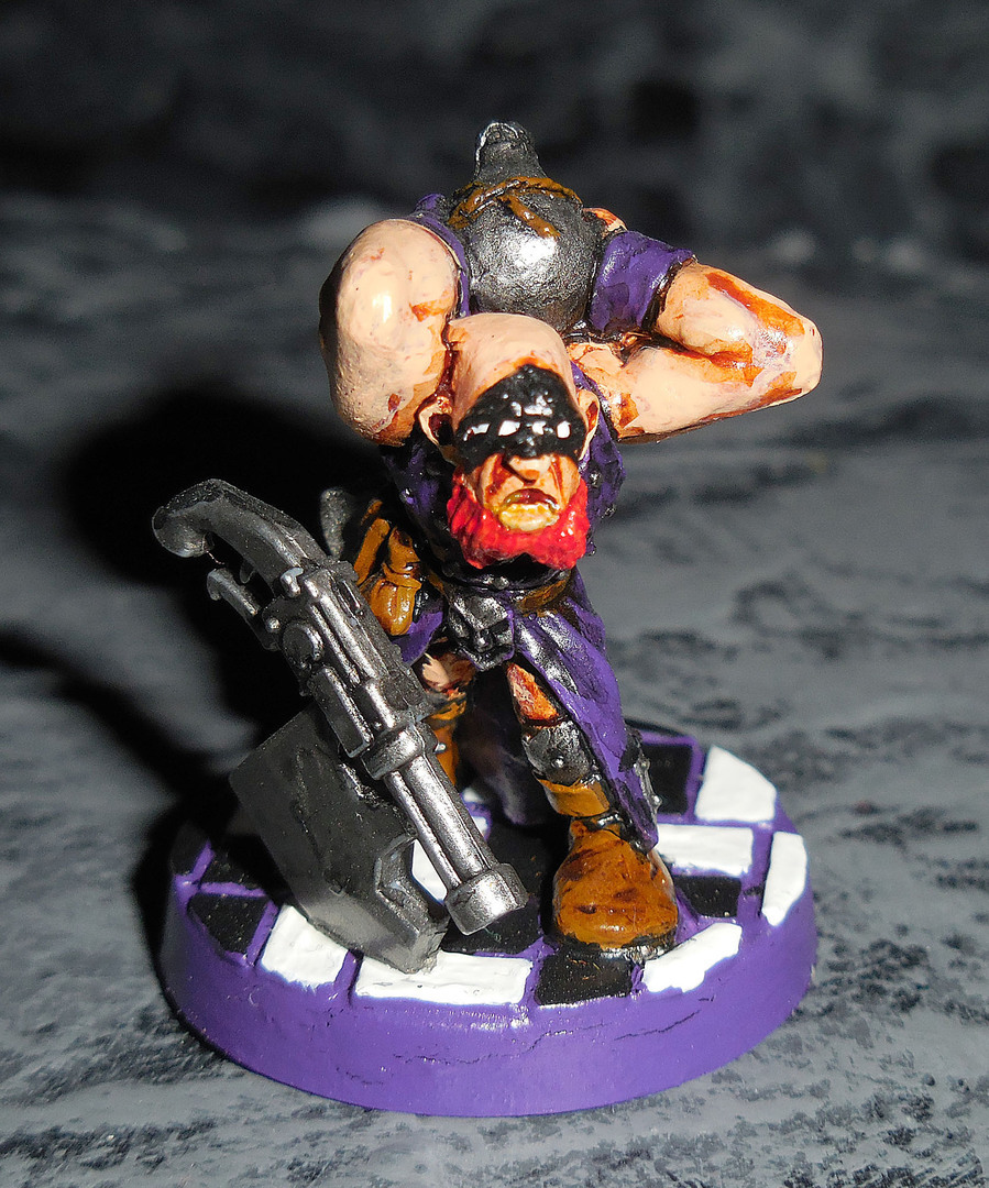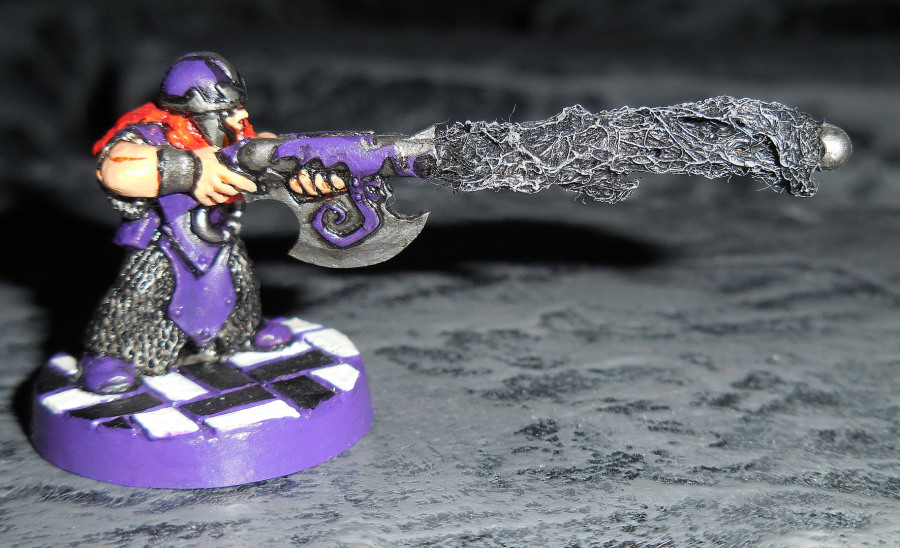 Die Idee mit der Kanonenaxt, die so an der Originalfigur war, finden wir echt gut. Daher haben wir kurzer Hand auch den anderen vier Modellen solche Waffen verpasst. Der Pistolen-Korpus stammt dabei aus (Warhammer) Mortheim, die Axtklingen aus verschiedensten Quellen. Das Blackpowder-Thema wird auch noch von einem weiteren Modell betont: einem glatzköpfigen Zwerg (auch wieder eine ungewöhnliche Darstellung), der gerade eine Bombe wirft. Damit er nicht als einziger ohne die nette Axtknarre auskommen muss, hat er seine zur Überbrückung in den Boden gehackt. So ohne Haare und Helm hat der Junge trotz Bart ein ähnliches Problem wie Kay-Fynn, es fehlt seinem Gesicht etwas an Struktur. Auch hier hilft Kriegsbemalung und erhöht auch gleich den optischen Zusammenhalt.