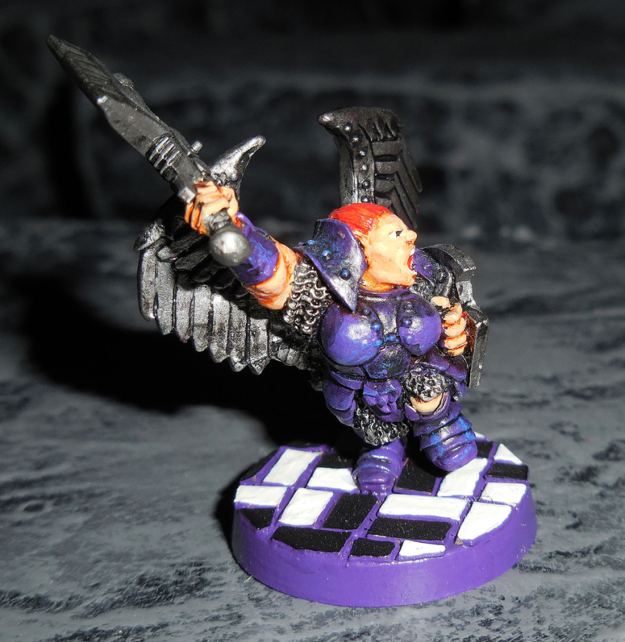 Dieser kann durch das fünfte Modell noch weiter erhöht werden, denn es handelt sich um einen weiblichen Zwerg, jetzt eben auch mit Kanonenaxt. Damit sieht die Dame aber noch nicht aus wie die Walküren, dafür braucht es Flügel. Glücklicherweise gibt es Zwergenstyle-Flügel unter den als Ersatzteillager verfügbaren Modellen, die des Chronopia-Zwerge Geier-Clan Krallen-Lords. Fertig ist die gepanzerte Walküre und der Kanonenaxt-Trupp.