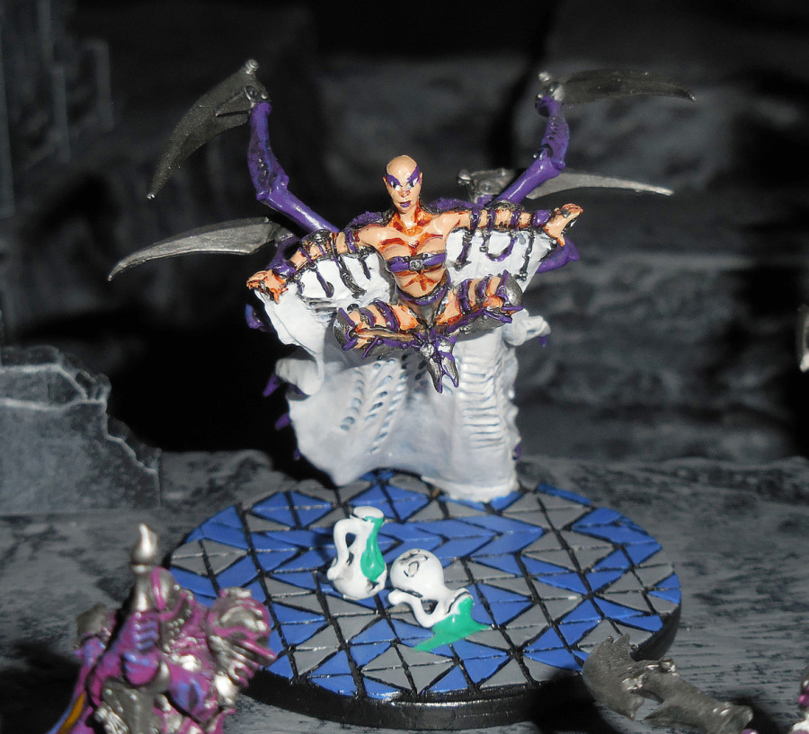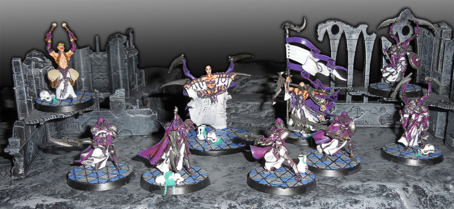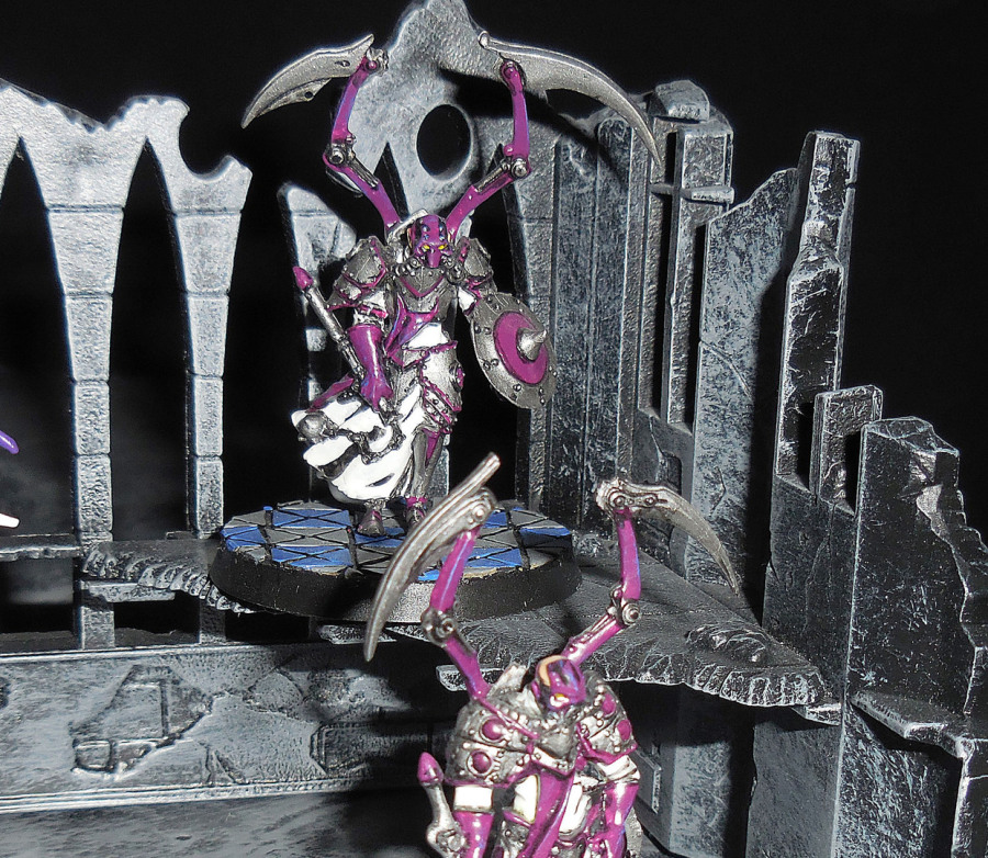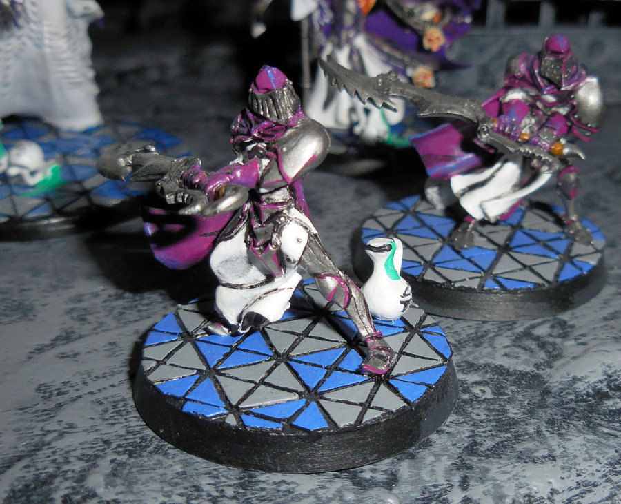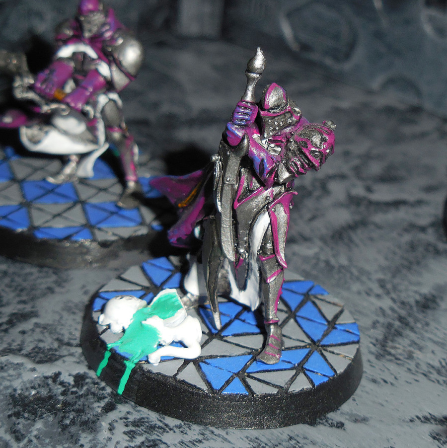 Eigentlich sind alle Miniaturen der Dirz irgendwie Spezialisten. Trotzdem sind die Krieger der Morgenröte so was wie ein Basis-Trupp. Angeführt werden sie von Arkheon Sanath, der im Prinzip genau so aussieht wie die normalen Krieger der Morgenröte, violette Rüstung, Handschuhe und Maske, dazu die weißen Gewänder. Arkheon lehnt sich cool auf sein etwas überdimensioniertes Schwert, welches interessanterweise ein „normales“ ist.