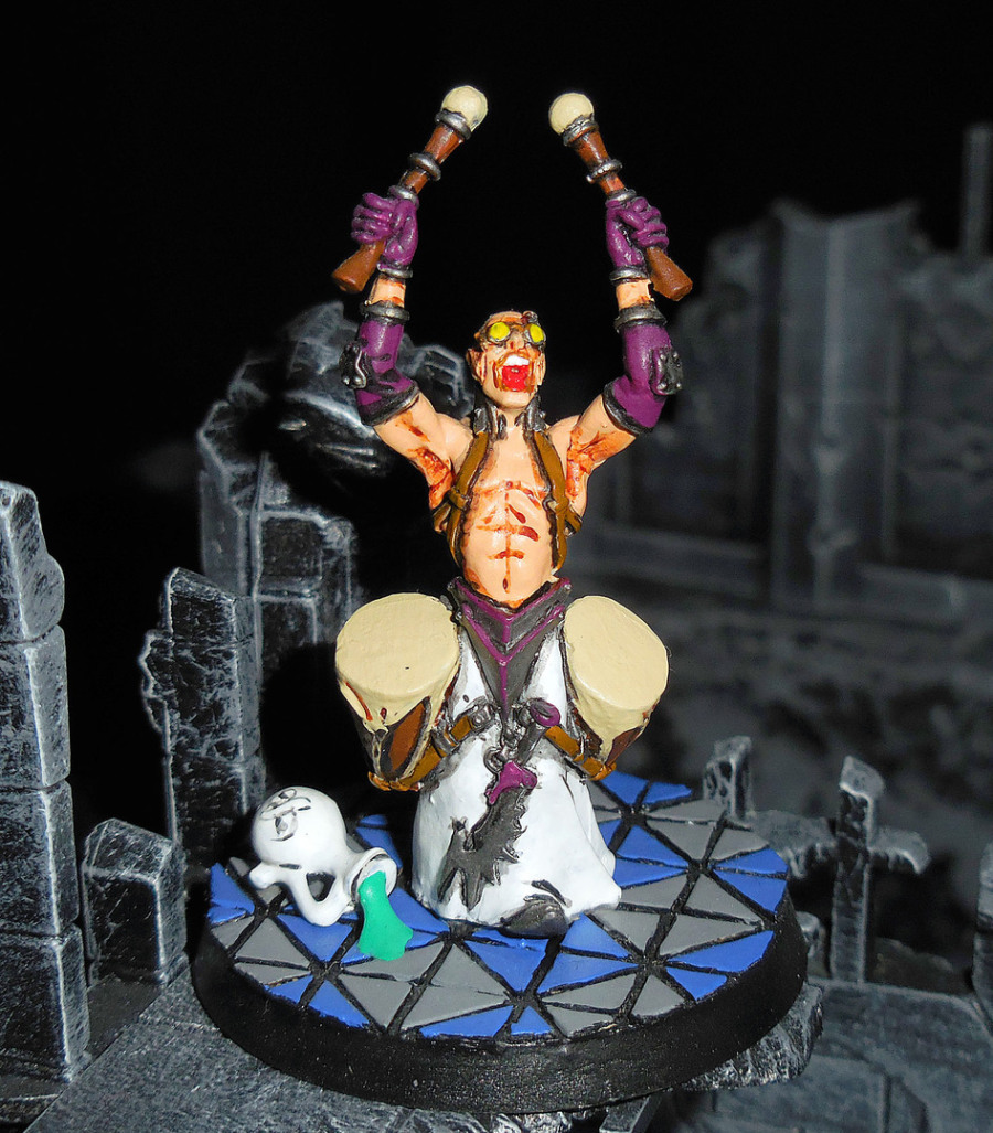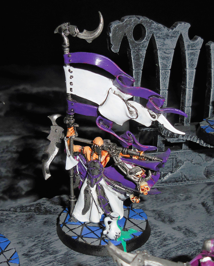Als logische Unterstützung für die Basistruppe ein Trommler und ein Flaggenträger. Anders als die meisten anderen Miniaturen zeigen diese Modelle auch etwas Haut. Der Trommler hat außerdem eine echt coole Steampunk-Style Brille. Der Standartenträger, Skorpion-Standarte, ist wieder superdynamisch gestaltet, man spürt quasi den Wind, der die Stoffe zum Flattern bringt. Beide Figuren sind wieder mit den gleichen aufwändigeren Bases versehen, Kacheln und Phiolen.