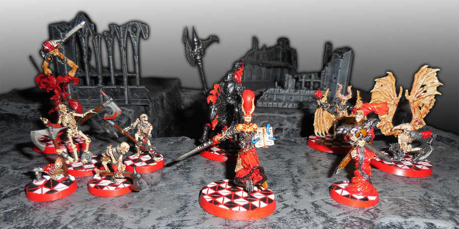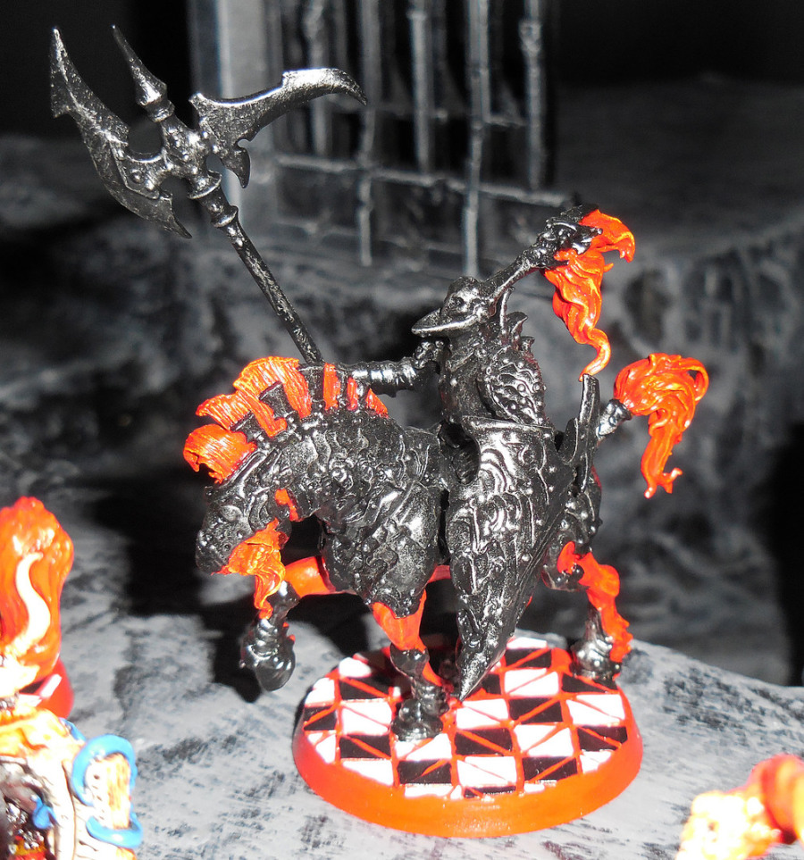 Die Basegestaltung beinhaltet auch Rot als Grund- oder besser Fugenfarbe. Darauf schwarze und weiße Kacheln, welche eigens für die Ausgestaltung untoter Paläste im Miniformat mit Hilfe des Höllenfeuers gebrannt wurden (nun ja, genau genommen wurden sie mit Hilfe einer Schere aus leeren Kartons, die der Aufbewahrung von Frühstücksflocken der Marke Kellogg's dienten, herausgetrennt und dann auf das Base geklebt).
