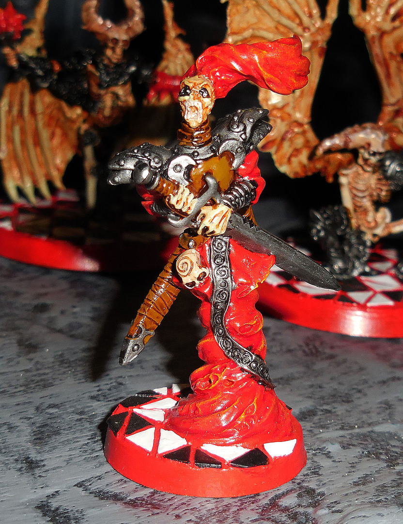 Schlussendlich als Anführerin Azael die Ungläubige. Auf den ersten Blick wirkt sie wie ein einfache Nekromantin, ein zweiter Blick lässt aber erkennen, dass hier Dämonisches vor einem schwebt (man beachte das kurze Stück Draht, das einen kleinen Abstand zwischen Figur und Base bringt). Neben dem Schweben bemerkt man schnell die Hörner und das aus Gehäuteten bestehende Kleid und Buch. Man fühlt quasi wie die bösartige Energie in Azael hineinströmt um in absehbarer Zeit einen verderbenden Zauberspruch zu wirken.