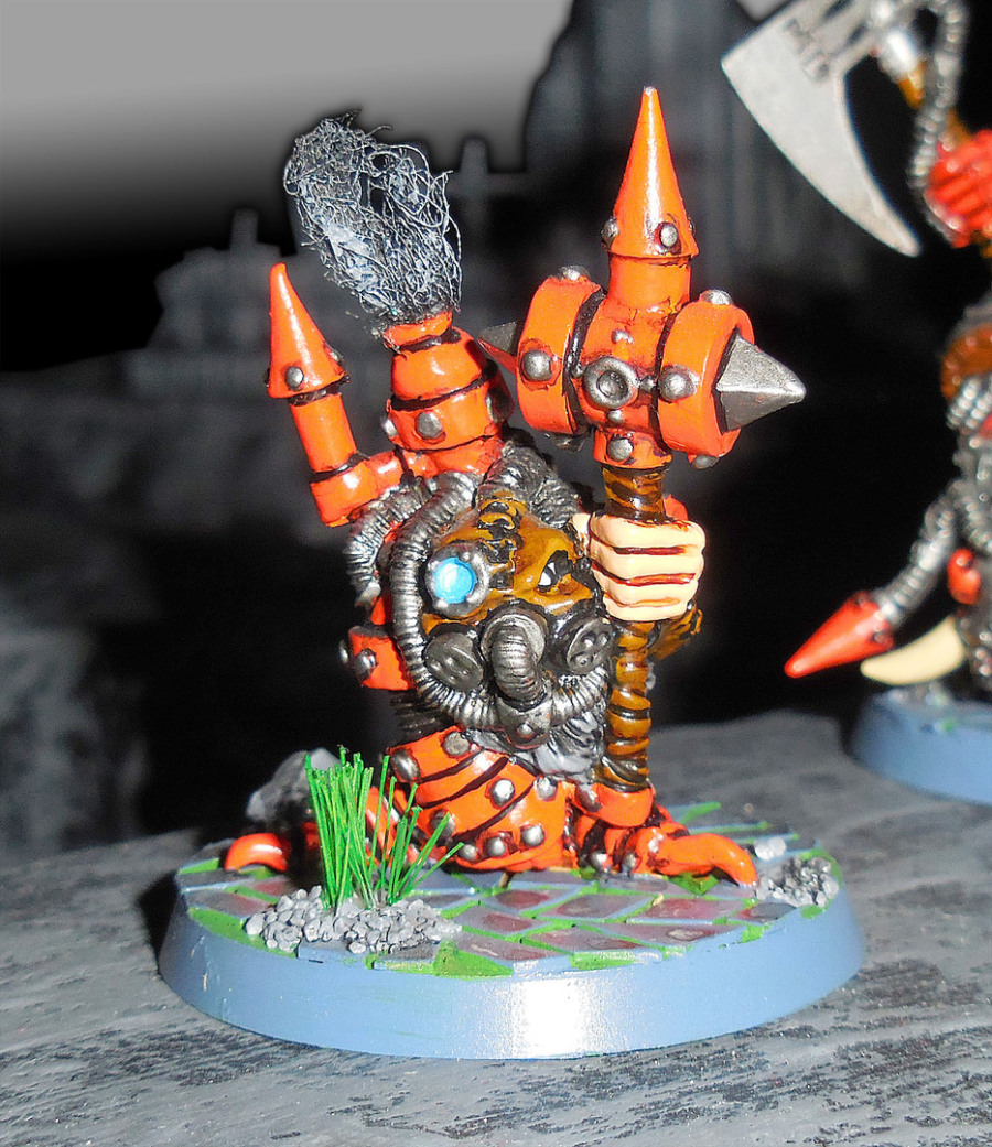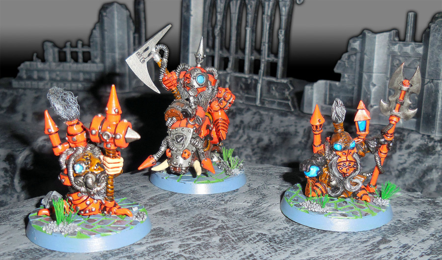 Bisher haben wir lediglich drei Modelle bis zum präsentationsfähigen Stand gebracht. Alle drei sind Thermopriester. Zwei sind dabei zu Fuß unterwegs. Einem der beiden haben wir ein wenig Stahlwolle als Rauch verpasst. Auch wenn das jetzt nicht spektakulär erscheinen mag, für unsere persönliche Entwicklung im Bereich Figurenum- und -ausgestaltung ist dieser Fitzel Stahlwolle ein absoluter Meilenstein. Er ist nicht weniger als der erste zaghafte Schritt auf einem Weg, der zu den rauchenden, qualmenden Modellen unserer "Chaos"-Zwerge (hier) und Warmachine-Miniaturen (hier) führte. Vielleicht könnte man die alten Herren hier diesbezüglich nochmal überarbeiten....