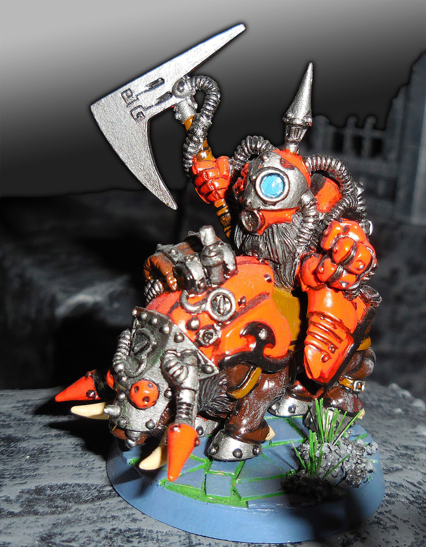 Dieser steckt nicht nur in einer noch cooleren Rüstung (der Helm hat einfach Klasse), nein, zusätzlich ist auch noch seine überdimensionierte Axt mit dem Dampfsystem verbunden und er sitzt auf einem richtig fetten Keiler, der ebenfalls zum Teil in einer Dampfrüstung steckt. Das ist mal wirklich ein sehr kompaktes, kampfstarkes, durch und durch zwergiges Modell. Schaut man sich die „Verkabelung“ und Struktur der Axt an, muss diese wohl Dampfstöße abgeben können. Dampfgegarter Feind, der direkt mit der Chop-Axt in Streifen geschnitten werden kann. Na dann, Mahlzeit!