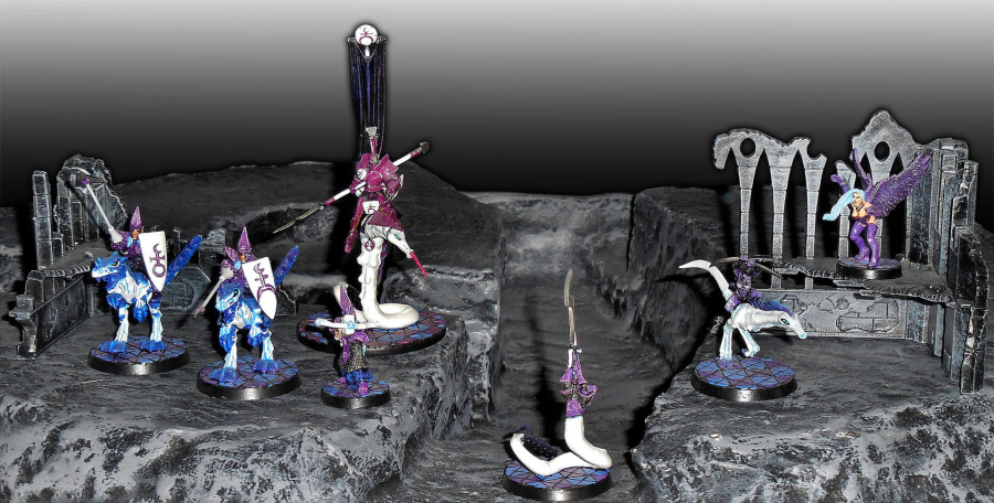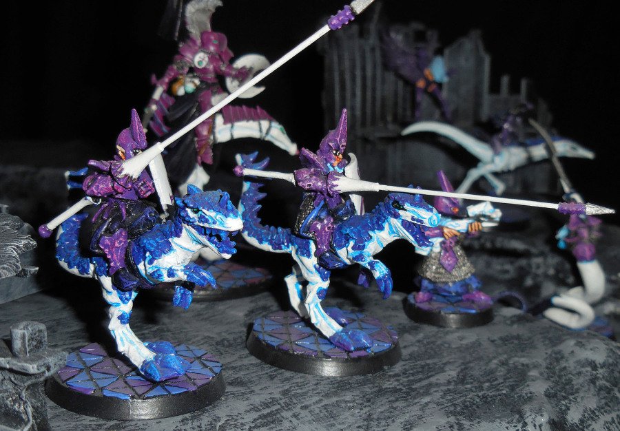 Wie schon gesagt, die Modelle stellen Überarbeitungen dar. Das bedingt ein eher langsames Wachsen und erklärt, warum es bisher eher wenige sind. Als erstes: Dunkelelfen Echsenreiter. Mit die schönsten Modelle, die GW jemals gemacht hat, wirklich. Einzig nervig, die Lanzen haben sich immer verbogen, daher zwei Schnitte mit dem Seitenschneider, ein Stück Schweißdraht als Ersatz für den Lanzenschaft und fertig. Wer immer diese Figuren designt hat, Glückwunsch! Die der späteren Editionen kacken echt dagegen ab (harte Sprache, aber einfach wahr). Zum Unterstreichen des Slaneesh-Themas noch entsprechende Hoheitszeichen auf die Schilde.