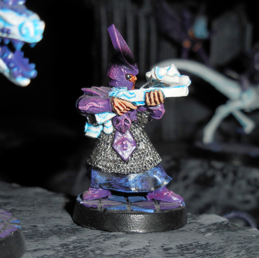 Als zweite Stütze der klassischen Dunkelelfenarmee: Armbrustschützen. Auch hier braucht es nicht wirklich eine große Umbaumaßnahme. Einzig, aber immens wichtig, der Bogen der Armbrust braucht eine Sehne, in diesem Fall aus dünnem Draht. Das ist so wichtig, weil ein Bogen ohne Sehne nicht schießen kann. Wie oft sieht man toll gestaltete Bogenschützenmodelle, und dann hat der Bogen keine Sehne. Das ist ja fast wie ein Elefant ohne Rüssel (den Witz verstehen wohl nur ein halbes Dutzend Leute).