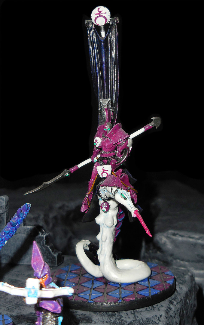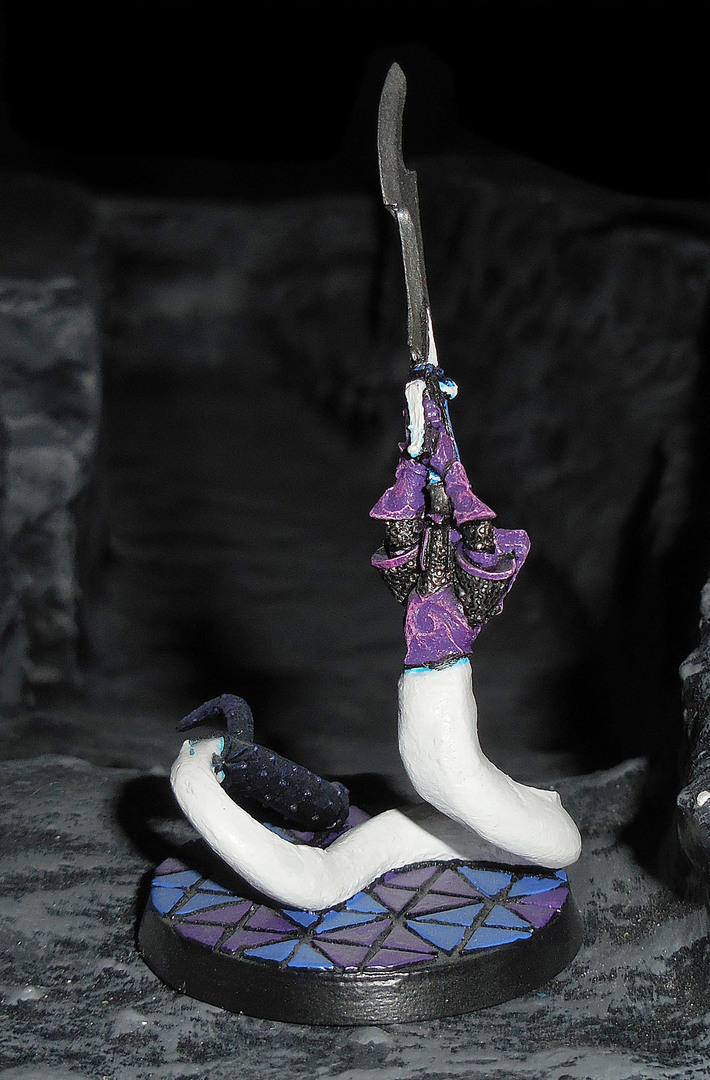 So, und dann noch eine Dunkelelfen-Slaneesh-Brücke. Ein Spezialnahkämpfer, ein Henker von Har Ganeth (2005er), Oberkörper aber ein Slaneesh-Schlangenpferdleib (ja, es sollte mehr Zentaurenabarten geben, siehe hier). Somit ist der Bund besiegelt, diese Dunkelelfen kämpfen mit anderen Kreaturen des Slaneesh.