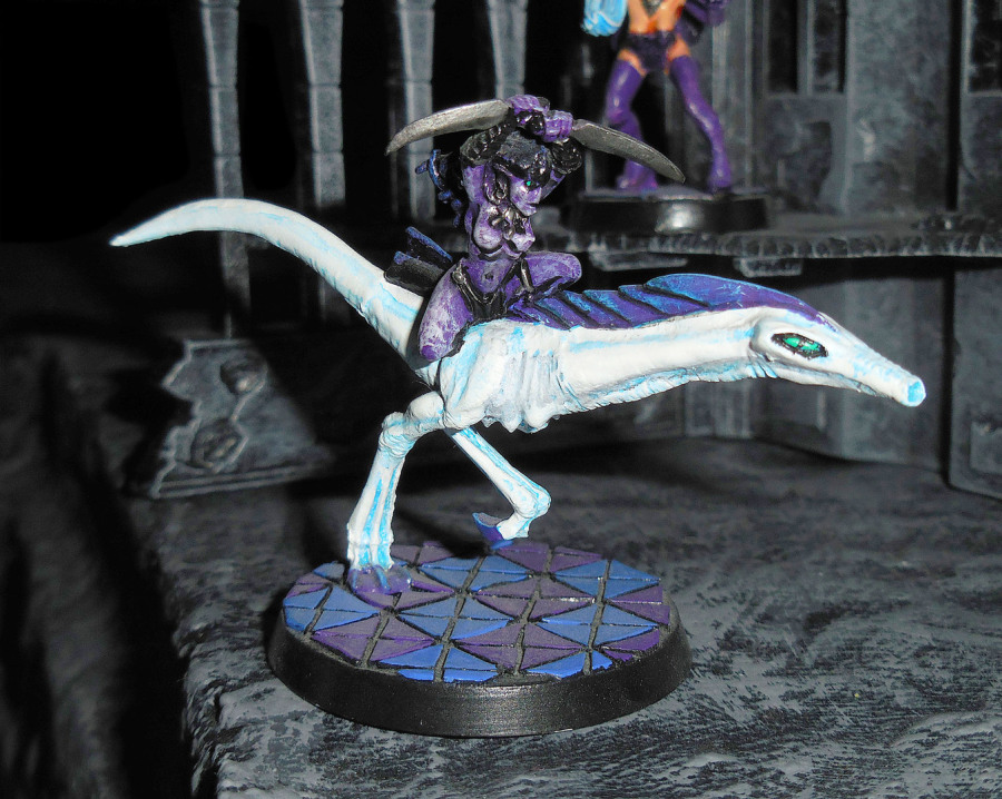 Noch etwas Slaneesh-Kavallerie, eine Dämonette auf einem Dämonenpferd, dessen Stil erstaunlich gut zu den alten Kampfechsen passt. Daher ist auch das Pferd weiß und die Dämonette violett, andersherum wäre auch gegangen (weiße 'Dämonetten' hier).