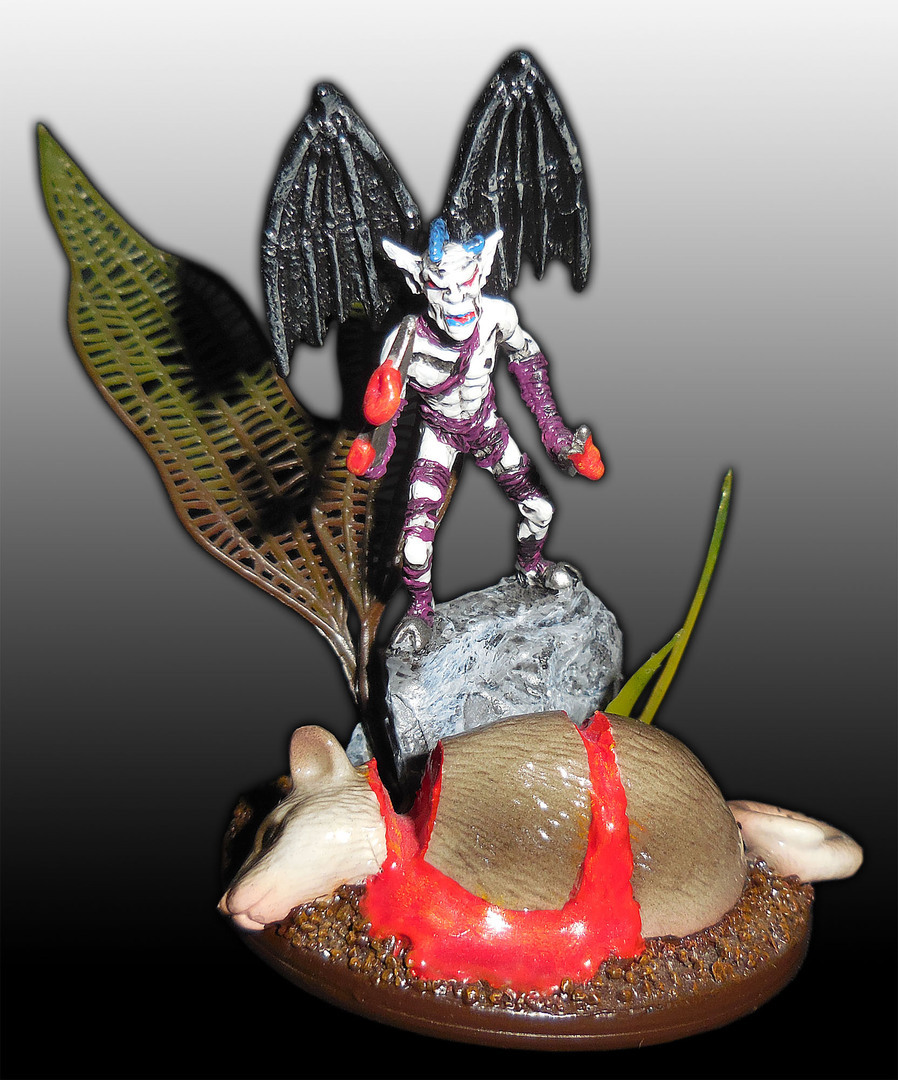 Den Vogel schießt aber die Blutfee ab. Diese hat eine ganze Maus niedergemacht. Blut und Hämolymphe wurden in allen Fällen mit ausreichend Holzleim modelliert. Insgesamt hat diese Feenbande damit sieben Mitglieder, die alle aufwändige Bases besitzen. Wir haben noch jede Menge Ideen, wie man andere Miniaturen für diese abgedrehte Hintergrundwelt konvertieren könnte. Bleibt abzuwarten wann eine dieser Ideen in die Realität durchbrechen kann.