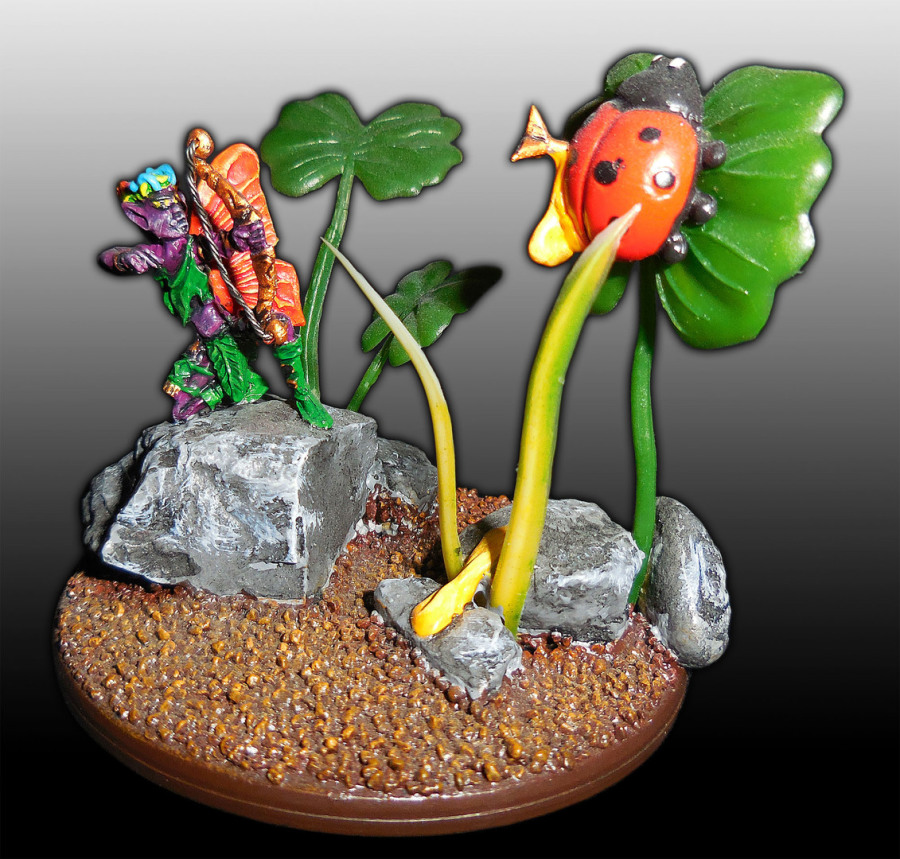 Als Basis dienen zwei Rücken an Rücken geklebte übergroße WH40K-Bases, natürlich mit Neodym-Magneten für den Transport. Darauf: Steine, echte Steine. Heißkleber wirkt bei der Befestigung Wunder, und klassisch anmalen kann man sie trotzdem wunderbar. Dazu Plastikpflanzen. Das gibt einen klaren Hinweis auf die Größe. Und als i-Tüpfelchen Insekten. Noch deutlicher geht es irgendwie nicht.