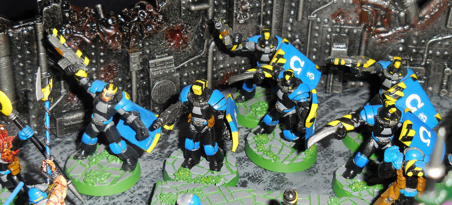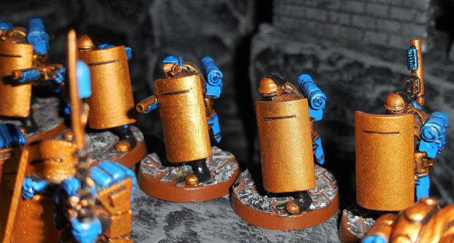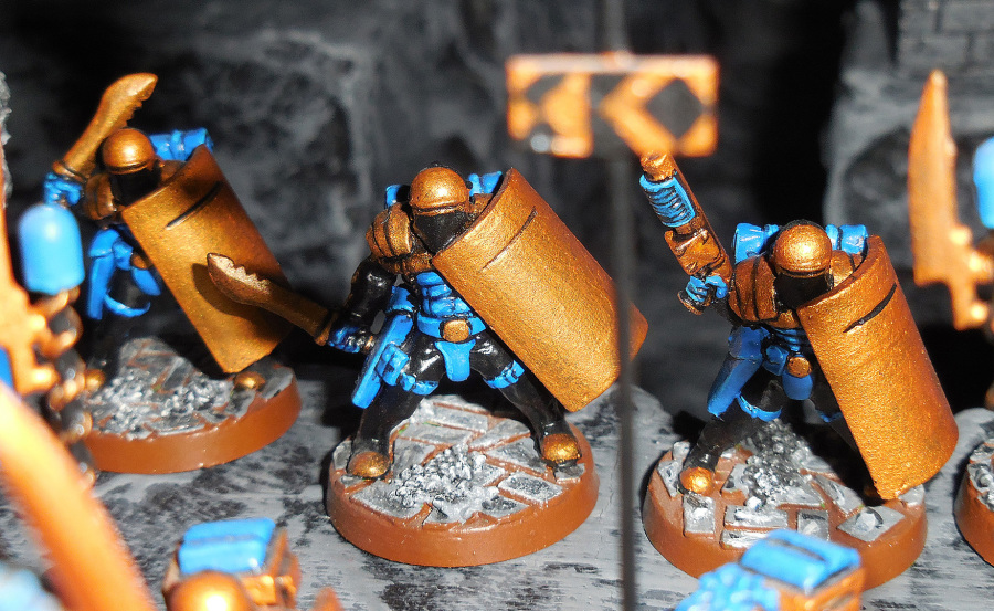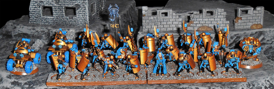 Unter den Sci-Fi-Tabletops war Void etwas Besonderes, weil es besonders schnell war durch ein truppenbasiertes Ziehen statt eines fraktionsbasierten Ziehens. Nur fünf Fraktionen gab es in diesem leider viel zu kurzlebigen Strategiespiel. Eine der beiden ersten für uns waren die Junker. Dabei ist nicht der 'Junk'-Aspekt für uns von Bedeutung, sondern eher der Stil, der stark an die römischen Legionen erinnert. Daher bezeichnen wir die Truppen lieber als Legionen von Ironglass, ihrem Heimatplaneten. Wie die Römer gehen die Ironglass-Truppen strategisch, überlegt und in Formation vor (daher passt uns eigentlich der ganze 'Convict'-Hintergrund nicht so; müssen wir mal noch was Längeres dazu verfassen). Daher halten wir Rot, die Farbe, in der die Junker zumeist bemalt werden, für äußerst unpassend für die Ironglass Legionen. Sie können nur Blau tragen.