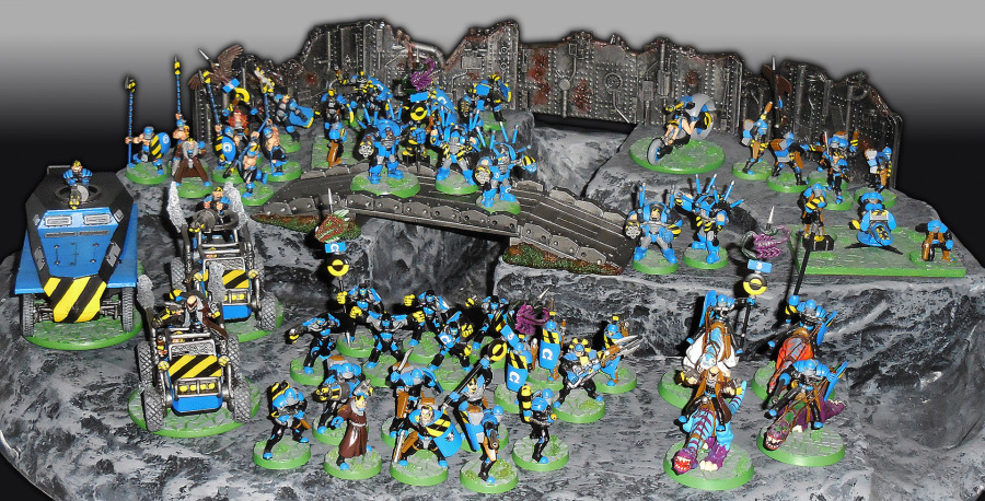 Über die Jahre haben wir das Design etwas verändert und die Modelle überarbeitet. Somit zeigen wir hier quasi Version 2.0 (ältere Fassungen weiter hinten). Blau kombinieren wir mit viel Schwarz und etwas Gold. Bases mit etwas Platten (aus Pappe) und Streu als Steinchen. Platten und Steinchen in Grau, Fugen in Erdfarben.