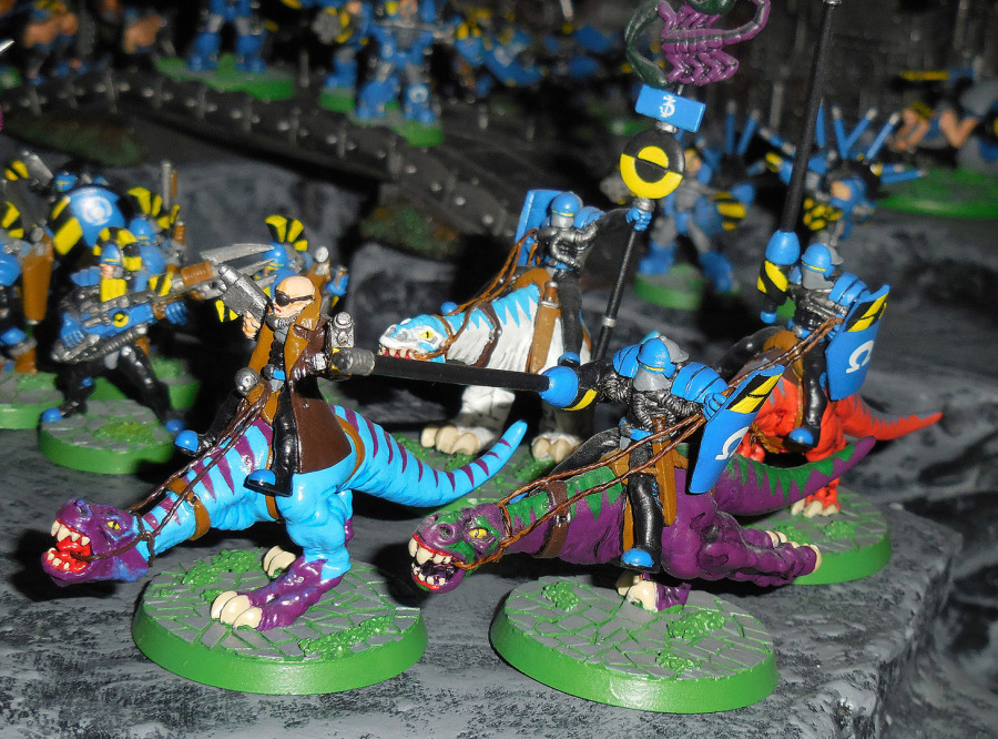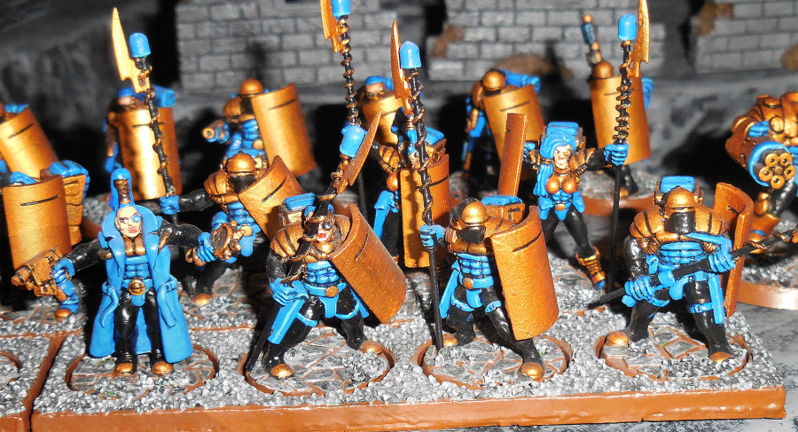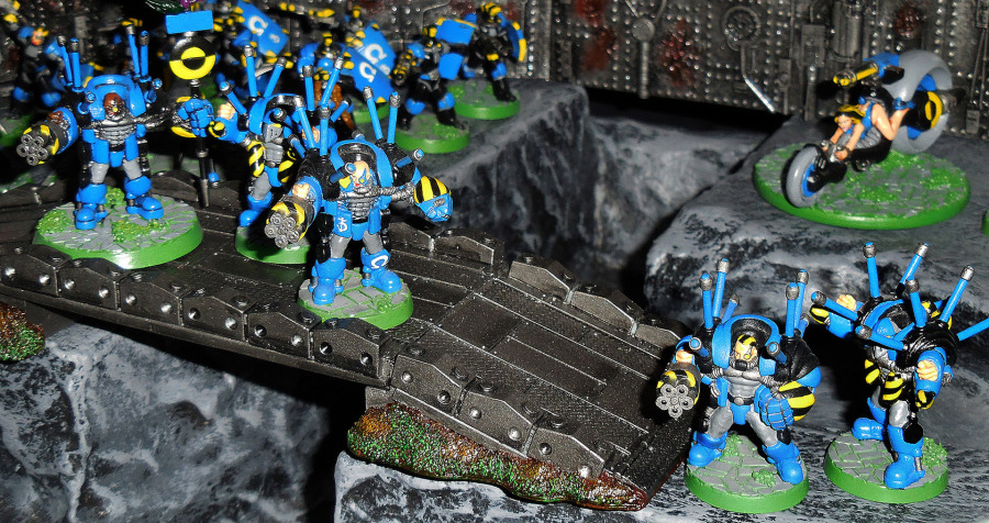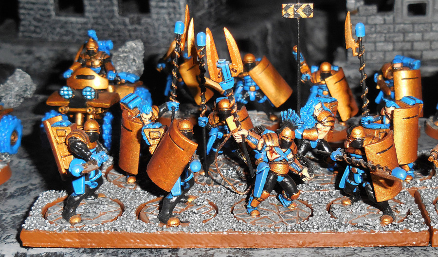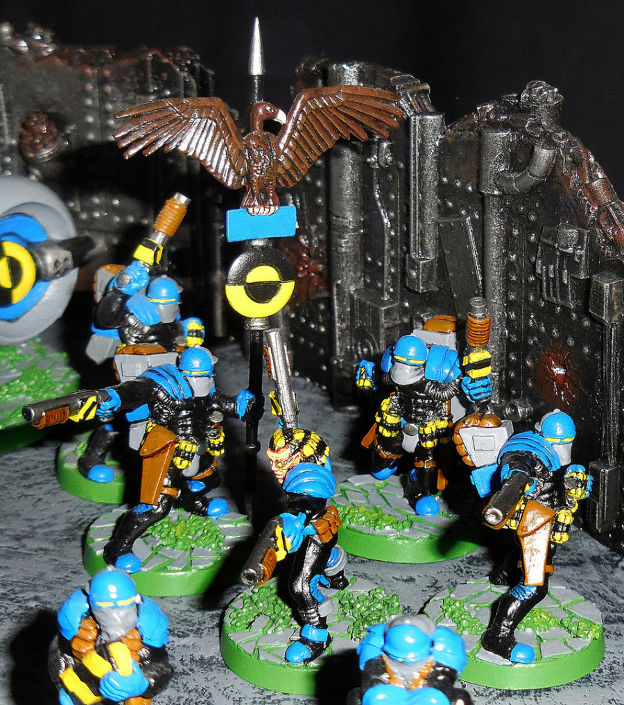 Und dann gibt es noch eine ganze Menge Figuren, die Spieler, die nicht von Anfang an dabei waren, verwundern werden. Was machen denn Syntha und Viridianer in einer Junkerarmee? Tja, so war das, damals, ganz am Anfang, als es nichts gab (ach, wir hatten ja nichts...), da durften verschiedene Fraktionen auf Teile der anderen Armeen zugreifen. Junker hatten zum Beispiel schwere Maschinengewehr- und Mörserteams, zumindest nach moderaten Umbauten der Figuren (oberer Teil des Originalkopfes ab, Junkerhelm, die konnte man ja extra kaufen, drauf, Greenstuff für den Mundschutz, Greenstuff und sekundenklebgetränktes Papier als Schulterpanzer). Sie durften auch Androsynths heuern (bauen?); zum Anzeigen der Fraktion tragen sie, neben den Farben, eine Standarte.