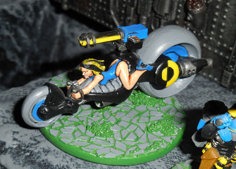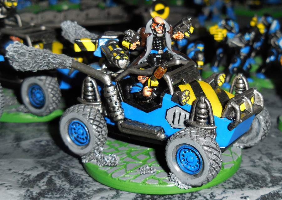 Während der Exosuit eher eine schwere Unterstützung darstellt, haben wir als zweites Dune Raider Quads. Zwei Stück davon haben es schon geschafft. Auf 40mm-Rundbases passen sie gut. Wichtig natürlich: der Auspuff muss ordentlich qualmen, mit Hilfe von Draht und Stahlwolle. Die Raider sollen sicher etwas das Mad-Max-Feeling der Junker hoch halten, hier sind sie aber die schlagkräftige Kavallerie der Ironglass Legionen, daher wird brav mit Helm gefahren. Das ist nicht nur sicherer, sondern betont trotz des modernistischen Gefährtes den Römeraspekt.