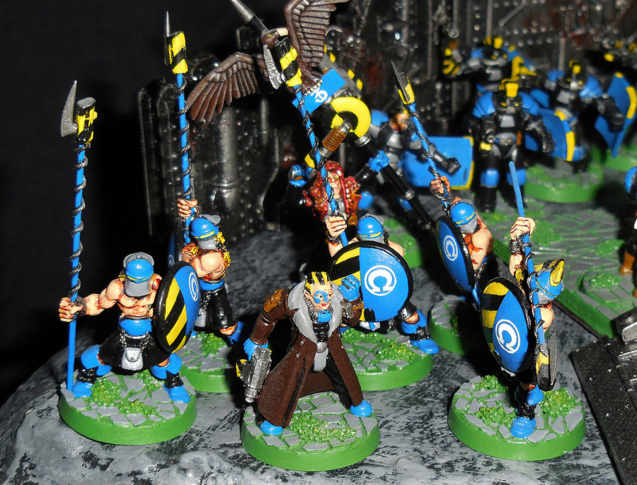 Ironglass Legionen brauchen erst mal Legionen. Daher zunächst eine ganze Einheit mit Lanzenträgern. Dafür gab es leider lange Zeit keine brauchbaren Modelle, zumindest nicht mit ausreichend langen Lanzen. Daher haben wir hier, was es so an Legionären gab, mit langen Schweißdrähten versehen. Mit Sprengspitze für die Regeln und Klinge für den Style. Die abgerundeten Sprengladungen sind die „Stecker“ von Schädeln aus dem guten alten Spiel Heroquest, die Schädel selbst wurden für anderes verwendet. Die Klingen stammen ganz klar von WH40K Dark Eldar, ein Volk, das ein besonders ergiebiger Klingenlieferant ist. Um die Sprengladung auszulösen braucht es natürlich einen Zünder, der wohl am Griff sein sollte. Daher braucht es noch ein Kabel, das zur Sprengladung hinaufreicht. Dafür wurde dünner Draht gedrillt und dann um den Schaft gewickelt. Die erste Reihe hält die Lanzen nach vorne, alle anderen nach oben.