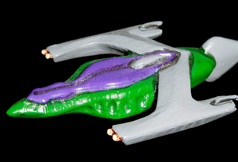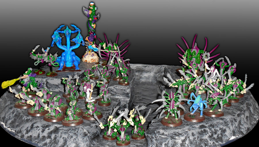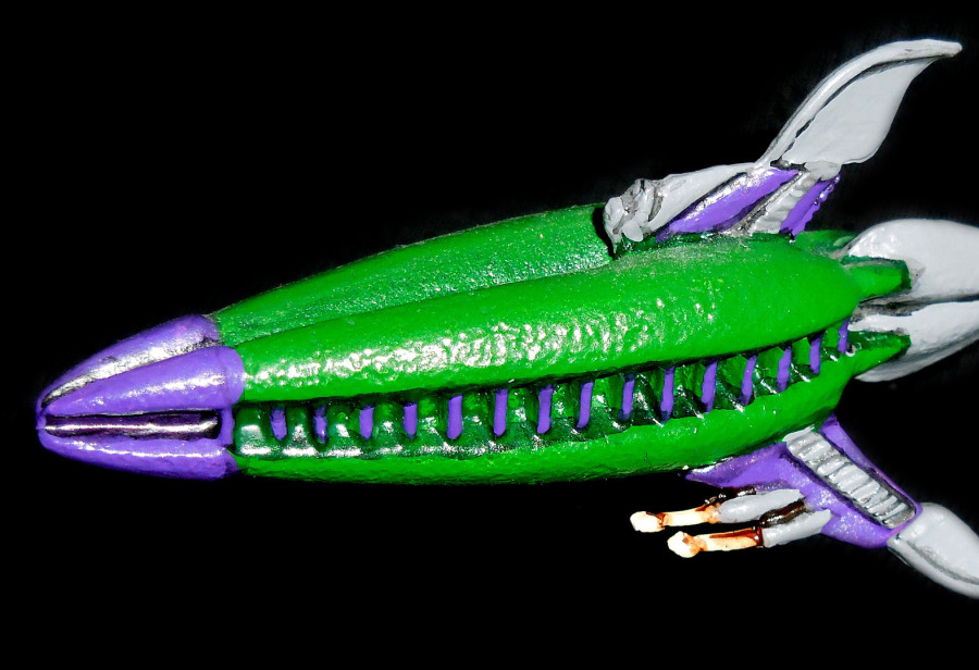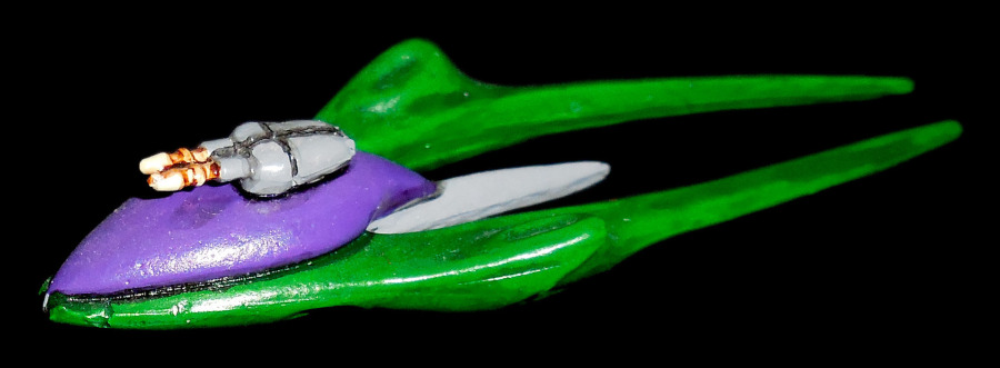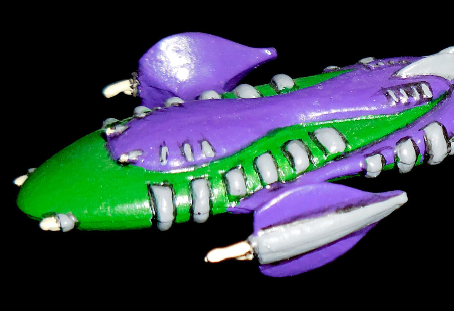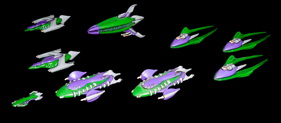 Ein kleines Extra hier: Koralon müssen irgendwie durch den Weltraum gelangen, mit Schiffen. Diese sind sicher nicht soweit organisiert (hmm, zweideutig) wie etwa die der Tyraniden. Daher hätten wir gerne Schiffe, die zwar recht organisch wirken, aber trotzdem klare Kanten zeigen. Wir haben hier kurzerhand einige Schiffe aus Babylon 5 in Koralonfarben angemalt. Mal sehen, wann wir die sinnvoll einsetzen können werden.
