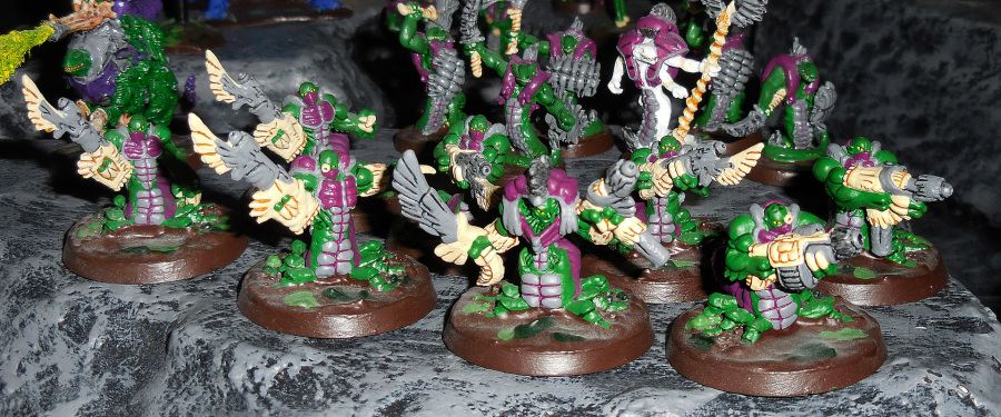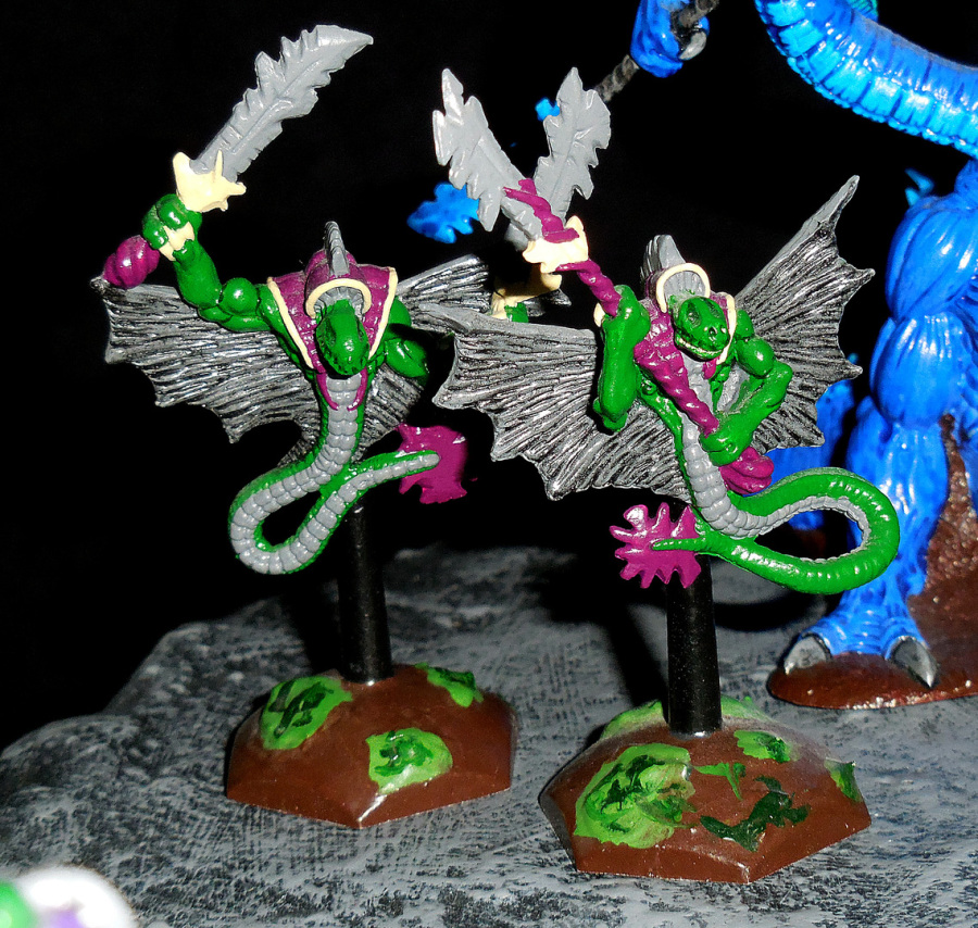 Für die Basegestaltung wurde vor allem Gips verwendet um mit brauner und grüner Farbe eine Sumpfoberfläche anzudeuten. Gelegentlich findet sich ein kleines Extra auf den Bases, verrückte Gewächse aus Green Stuff, oder einfach ein übergroßes Schneckenhaus, was ein in Wirklichkeit recht kleines, echtes Schneckenhaus ist.