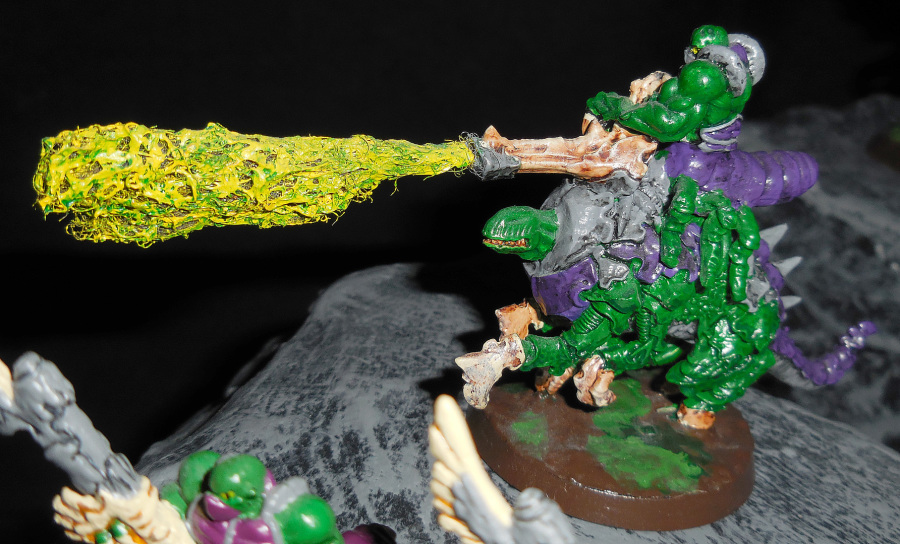 Als schwere Unterstützung klettert noch einer dieser Arakton-Typ-Fernkampfmutanten auf ein Ungetüm, das Stahlwolle-Feuer spuckt. Grundlage hierfür ist ein Modell der Tyraniden aus Warhammer 40K Epic (ja, auch das ein ganz anderer Maßstab), eine Dominatrix, aber der Kopf wurde gegen den eines Koralon getauscht.