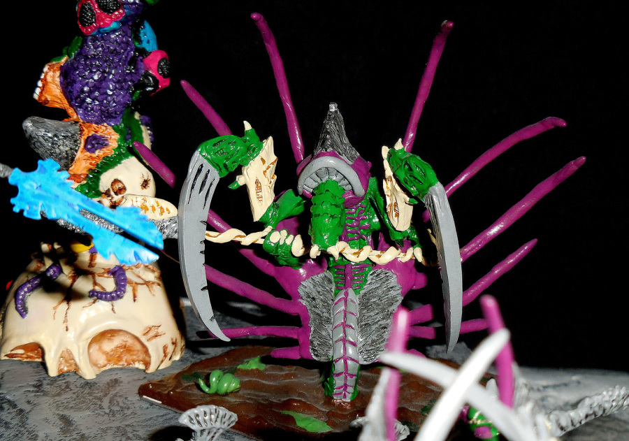 Weil diese Monster so erschreckend cool daherkommen, musste noch ein zweiter her. Aber woraus könnte man so etwas basteln? Ein Schlangenkörper als Grundlage wäre schon mal gut. Schließlich stießen wir auf einen Tyraniden (Ähnlichkeiten bereits erwähnt), einen Venator (von 2005), der mit reichlich Draht und Green Stuff einen passablen Brutmeister abgibt.