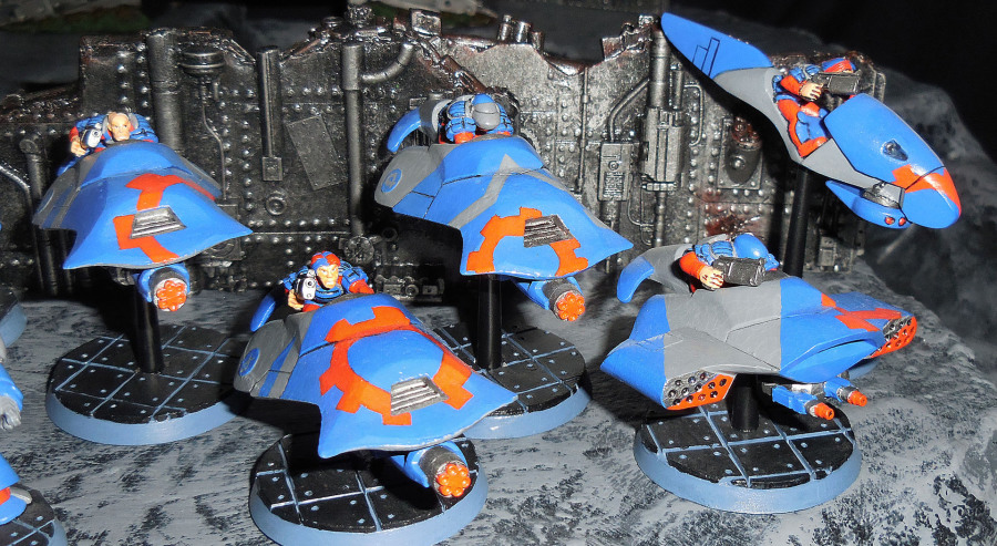 Die Syntha haben noch jede Menge schicker Modelle, die aber eben noch im alten Stil bemalt sind. Dabei haben wir versucht die wuchtige Wirkung von Orange durch Grau und Violett-Blau abzumildern. Darunter Nahkampf- und Fernkampf-Synths; vor allem die letzten sind extrem schicke Modelle; verschiedene Speederbikes und noch ein Panzer. Nach und nach sollten diese Modelle neuinkarnieren. Bleibt zu sehen, wie schnell die Karma-Maschine diese Reinkarnation bewerkstelligen wird.
