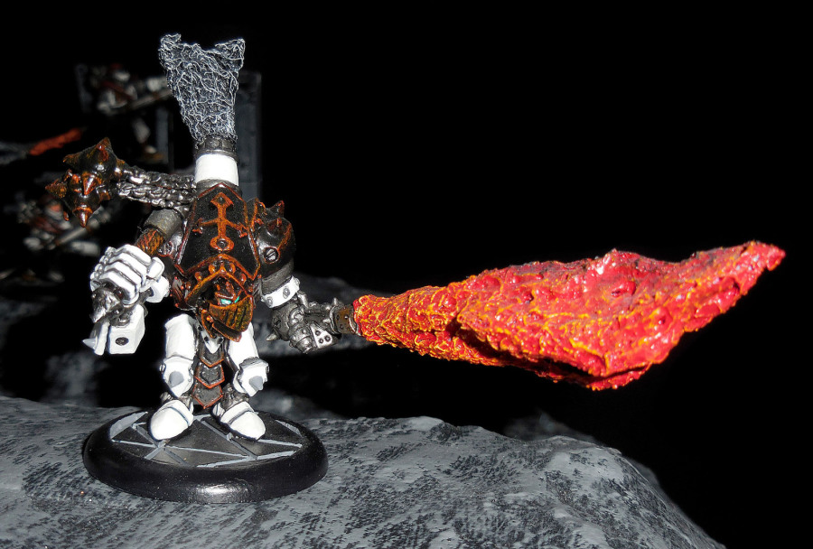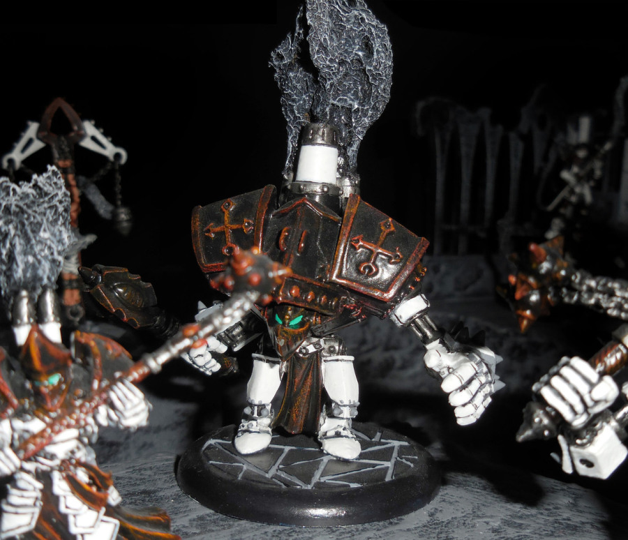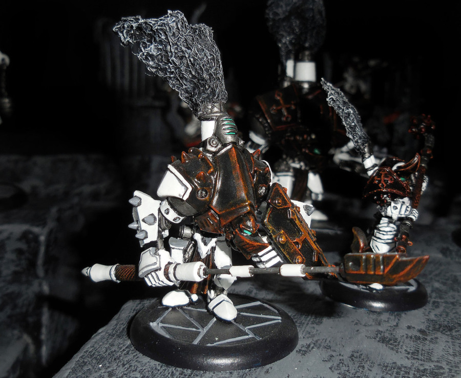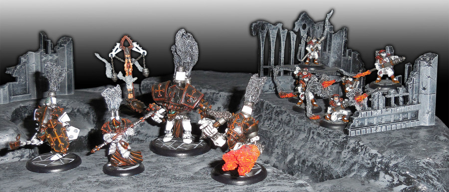 Die Menoth sind eine religiös-motivierte Fraktion des Steampunk-Fantasyspiels Warmachine. Menoth teilen viele Ansichten mit den Khador (siehe hier). Auch ihre Grundfarbe ist in der Tat dieselbe. Denn Menoth sind religiöse Fanatiker, brennen für ihren Glauben und schreiten mit dem (ihrer Meinung nach) gerechten Zorn voran. Damit sind Menoth so rot wie die Khador auch. Trotzdem ist das Rot hier verhaltener, etwas gezähmter, eingeschränkt durch Tradition und Ritual. Daher musste eine etwas andere Farbgestaltung her. Die Hauptfläche bleibt weiß, eine passende Farbe für religiös-kirchlich geprägte Miniaturen. Dann weniger Fläche in tiefem Schwarz. Das Schwarz wurde dann rot trockengebürstet (und zunehmend heller), dadurch erscheinen die Kanten in glühendem Rot. Somit bleibt Rot die bestimmende Farbe, aber eben etwas verhaltener als bei den Khador.