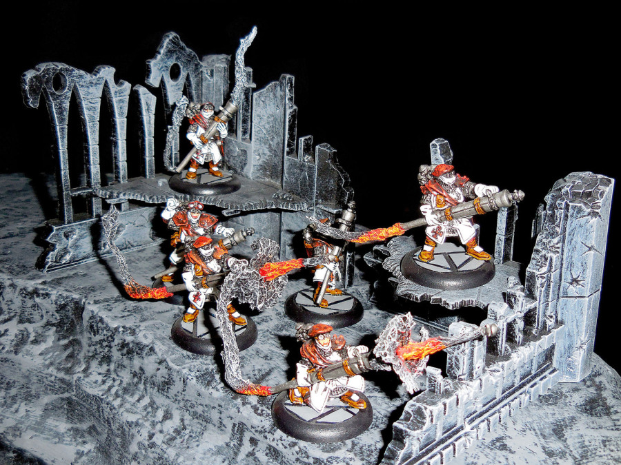 Das gilt sogar für nicht dampfgetriebene Modelle. Als Beispiel: ein Team mit Raketenwerfern ("Deliverers"). Alle bis auf einen haben wieder reichlich Stahlwolle erhalten. Da sind zwei Mann, die gerade ihre Raketen abfeuern. Nicht nur vorne aus der Mündung, sondern auch hinten aus der Abschussröhre sieht man klar Feuer und Rauch. Die Raketenköpfe wurden einfach vom Rohr entfernt (Seitenschneider) und mit Drahtstücken in einiger Entfernung wieder befestigt. Der Rauch versteckt den Draht auf elegante Weise. Bei anderen Modellen zündet die Rakete gerade erst oder ist bereits abgefeuert worden, sodass die Abschussröhre an beiden Enden raucht. Um die Variation hoch zu halten hat wenigstens ein Mitglied des Trupps seine Rakete noch abschussbereit im Rohr, ganz ohne Rauchentwicklung am Modell.