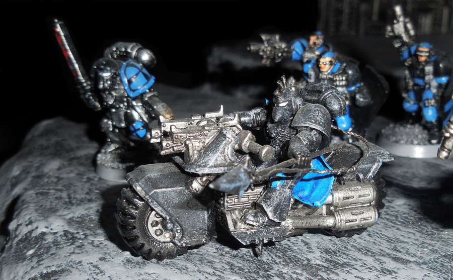 Die anderen Veteranen tragen ebenso die Helme in Schwarz, die Rüstung in Silber. Blau sind hier nur die Kutten, denn die Modelle waren mal Dark Angels, inklusive Asmodai, der aber neue Bewaffnung erhielt. Das Tatzenkreuz tragen die Veteranen auf den Kutten. Außerdem tragen die Helme echte Kämme aus Zahnbürstenborsten. Als Nahkampfwaffen tragen die Veteranen „Herkömmlicheres“, können daher ihre Bolter mit der freien Hand bedienen (á la Space Wolves). Um den „Kuttentrupp“ noch aufzufüllen das Modell eines ganz alten Psionikers (der seinen Bart blau gefärbt hat).