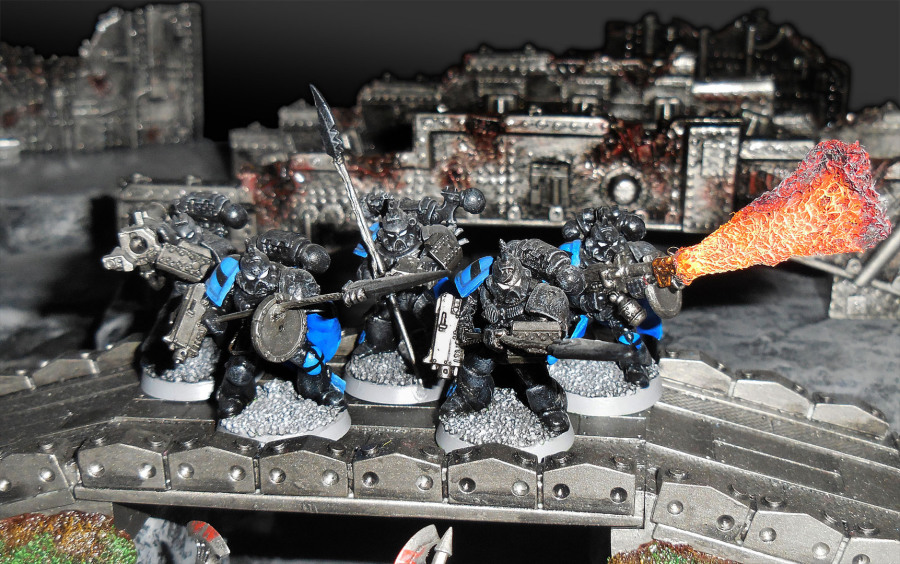 Der Truppführer hat klassisch eine Bolterpistole, aber auch Lanze und Schild (wieder aus Warzone entlehnt). Zwei Spezialisten füllen den Trupp auf: ein Raketenwerfer und ein Flammenwerfer, der dank Draht und Stahlwolle auch sichtlich Feuer spuckt. Auf dem blauem Grund von Schulterpanzer (und Kniekacheln) tragen die Eisernen Engel ein simples Tatzen-Kreuz (ein Symbol, das das Blau widerspiegelt).