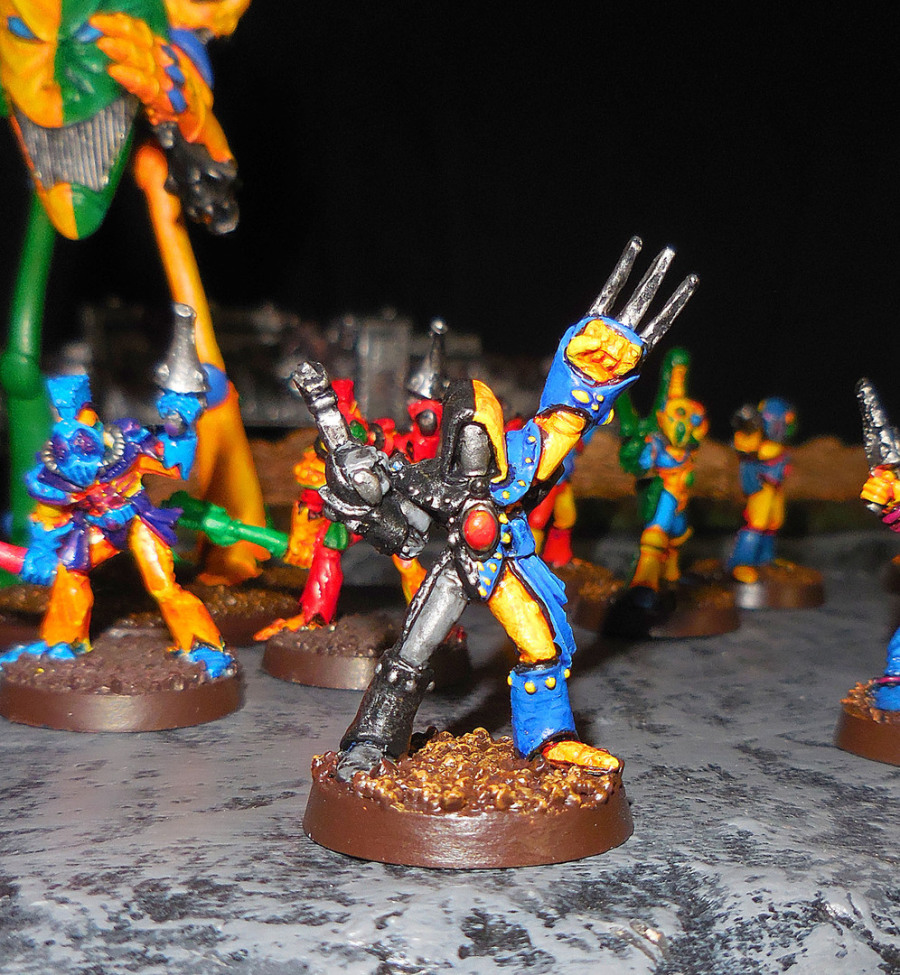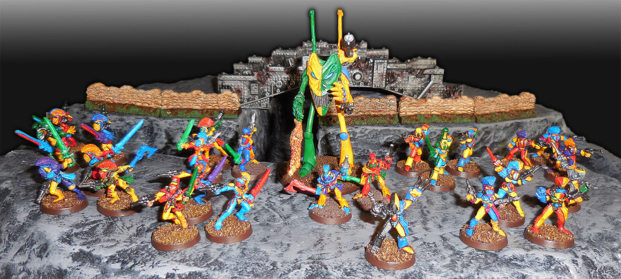 Die Eldar sind sowas wie die Elfen des Weltraums im Science-Fiction-Spiel Warhammer 40K. Ihr Aussehen lässt das auch unschwer erkennen, hochgewachsene, schlanke Körper, hohe Schädel, spitze Ohren. Die Eldargesellschaft ist aufgeteilt in verschiedene Lebensweisen, etwa die Weltenschiffbewohner, die Exoditen oder die abscheulichen Dark Eldar. Die Edelsten unter ihnen sind jedoch die Harlequine. Sie sind bisher die einzige Streitmacht, die widerspruchsfrei gelb tragen kann, denn sie opfern sich für die anderen ihrer Gesellschaft und eigentlich für alle anderen Wesen der Galaxis. Sie sind die Anhänger des lachenden Gottes. Dieser beschützt die Harlequine und ihre spirituelle Energie, sodass Harlequine anders als Weltenschiffeldar keine Seelensteine tragen müssen.