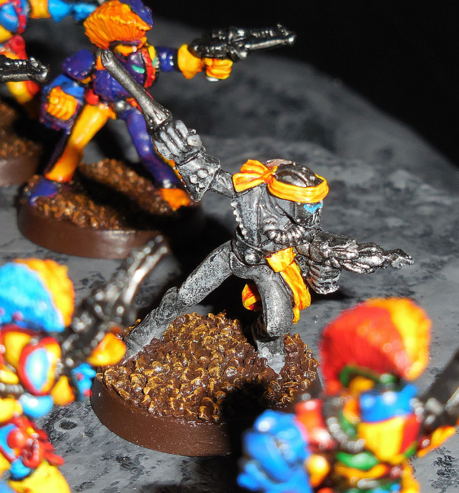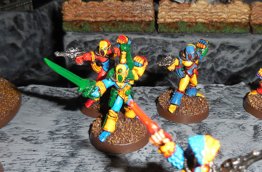 Neben Gelb kann man sich bei den Harlequinen farblich richtig austoben, sie sollen ja bunt erscheinen. Nur die Spezial-Rollen wie Solitär und Schattenseher tragen auch Unbuntes (wenn die Todesjoker irgendwann fertig sind, wird das für die auch gelten). Eigentlich kann man die Figuren völlig beliebig zu Trupps arrangieren, wobei ... Es stellt sich doch die Frage, ob Harlequine eigentlich überhaupt in echten Trupps unterwegs sein sollten. Sie sind schließlich echte Freigeister, und von ihrer prinzipiellen Kampftaktik könnte man bestenfalls erwarten, dass sich kurzfristig Aktionsgemeinschaften für einen gezielten Einzelschlag bilden, die sich dann aber wieder in alle Richtungen zerstreuen. Lässt sich regeltechnisch aber wahrscheinlich schlecht umsetzen. Aber irgendwie muss man die Modelle fürs Fotografieren ja arrangieren. Hier haben wir sie so zusammengestellt, dass man die kleinen Modellierungsvariationen sehen kann. Alles Originale, keine wirklichen Umbauten, nur mal ein bisschen biegen hier und da (wieder mal ein klares Plus der Metallmodelle).